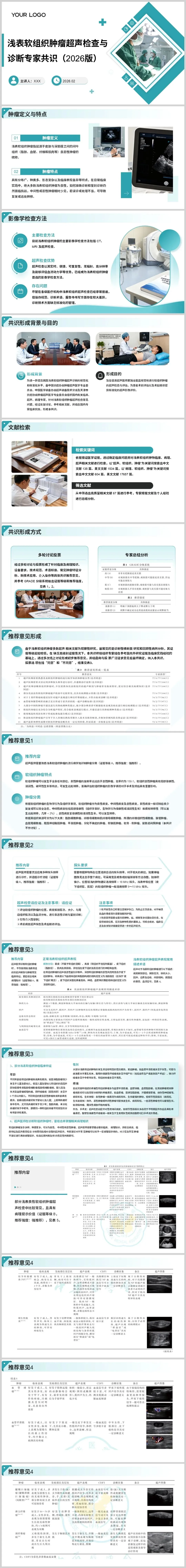 共识明确浅表软组织肿瘤为皮肤与深筋膜间叶组织的良恶性肿瘤,超声因实时便捷、无辐射等优势成为首选检查手段。核心推荐超声医师掌握肿瘤流行病学、分类及病理知识,灵活选用探头频率:浅表小肿物用>18MHz 探头,皮下及肌层肿物用 9~15MHz 探头,需多切面动态扫查并结合病史分析。