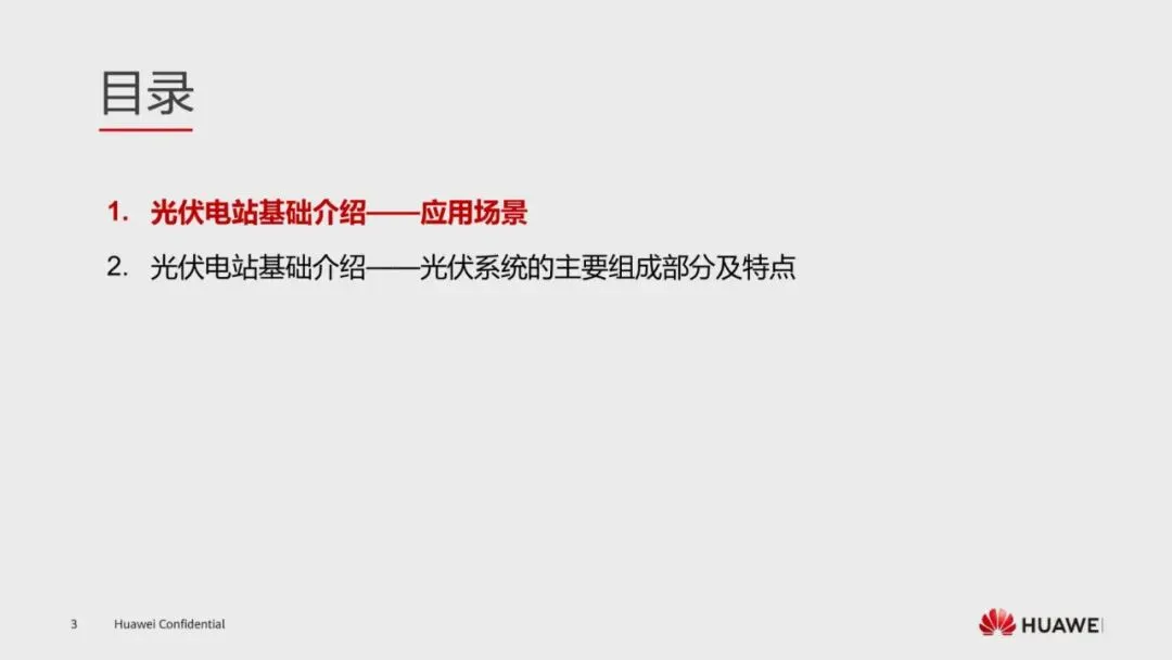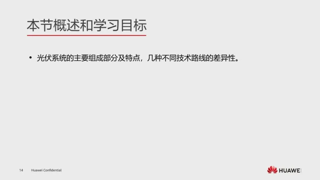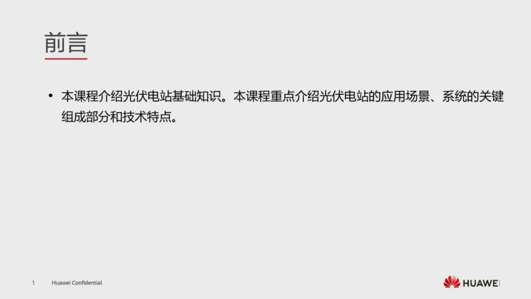 1、光储电站基础知识:本课程介绍光伏电站基础知识。本课程重点介绍光伏电站的应用场景、系统的关键组成部分和技术特点。目标是了解光伏电站的应用场景,了解光伏电站的关键组成部分,了解光伏电站的技术特点。