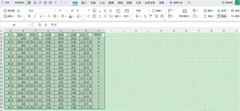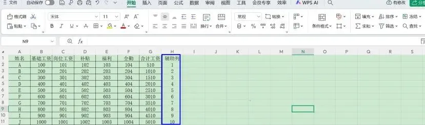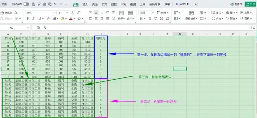 接着,在辅助列再复制一遍序号(即下图紫色方框),下一步,则是将表头全部复制(即下图绿色区域)。