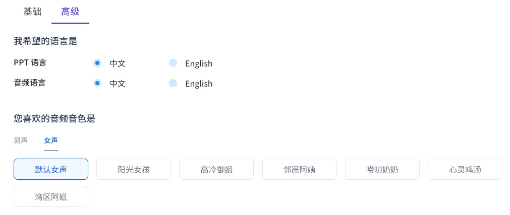 而PPT的语言以及音频音色都可以进行调整