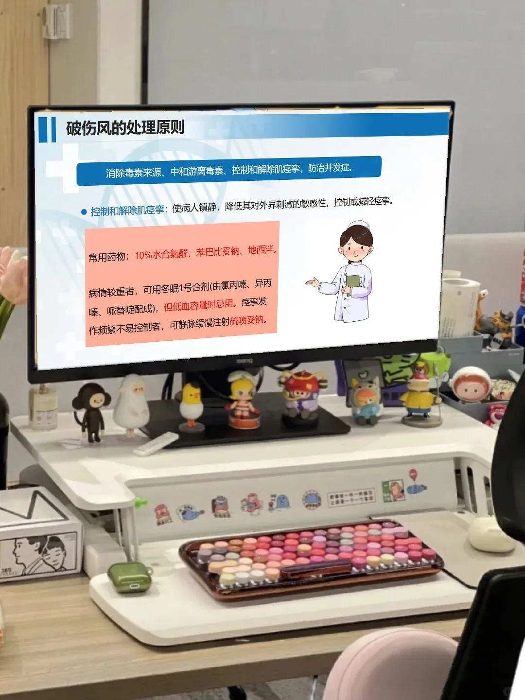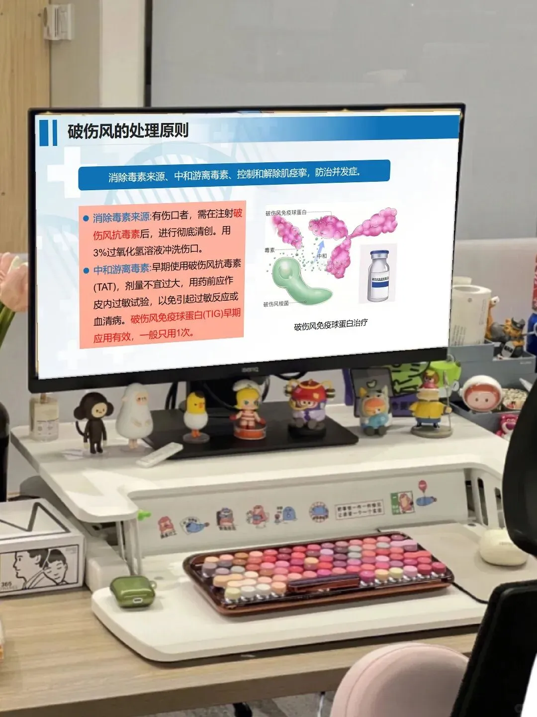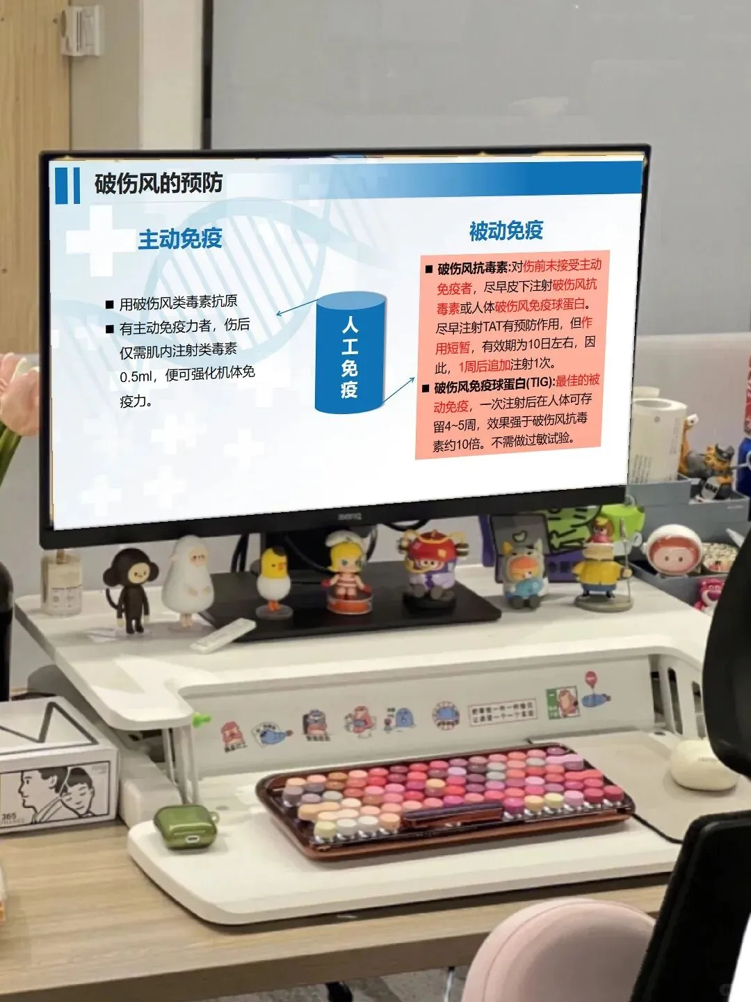 日常护理里,咱们还要把细节做扎实:将患者安置在单人隔离病室,减少刺激避免诱发痉挛;严格执行接触隔离,器械敷料专用并规范消毒;根据病情给予营养支持,做好体温、脉搏等生命体征的严密监测。另外,破伤风的预防也很重要,主动免疫和被动免疫的相关知识,咱们不仅要掌握,还要做好健康宣教,让患者和家属了解预防要点。