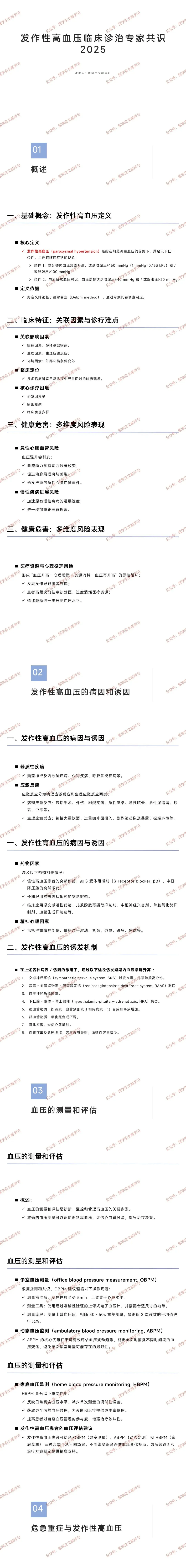 - 与既往指南关系:发作性高血压是高血压领域特殊现象,既往指南因篇幅未专门论述,本共识为其复杂临床场景提供补充,强调病因识别、急症处理与预防。