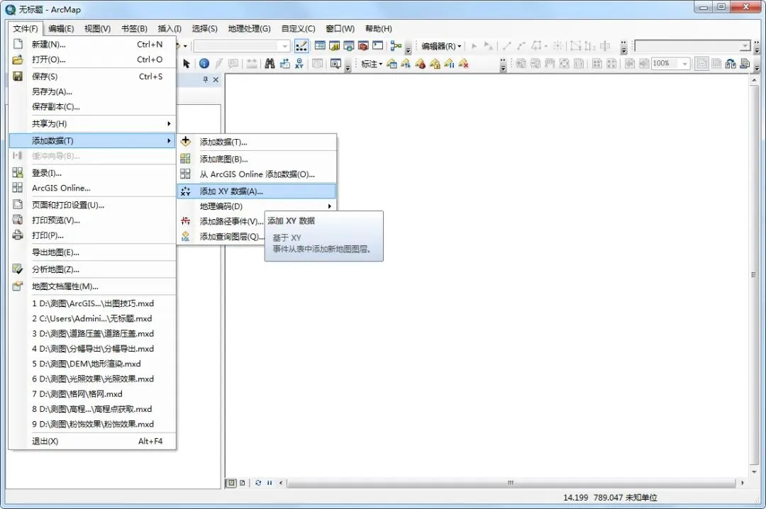 打开 ArcMap,在菜单栏上点击添加数据,选择添加 XY 数据,如下图所示。