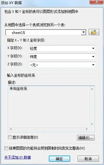 在显示的添加 XY 数据对话框内,选择 X 字段为经度,Y 字段为纬度,如下图所示。