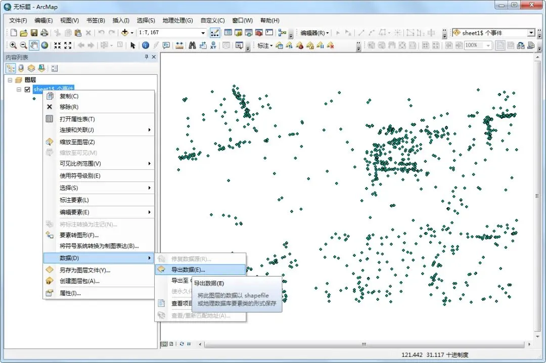 在导入的坐标点图层上点击右键,选择“数据\导出数据”,如下图所示。