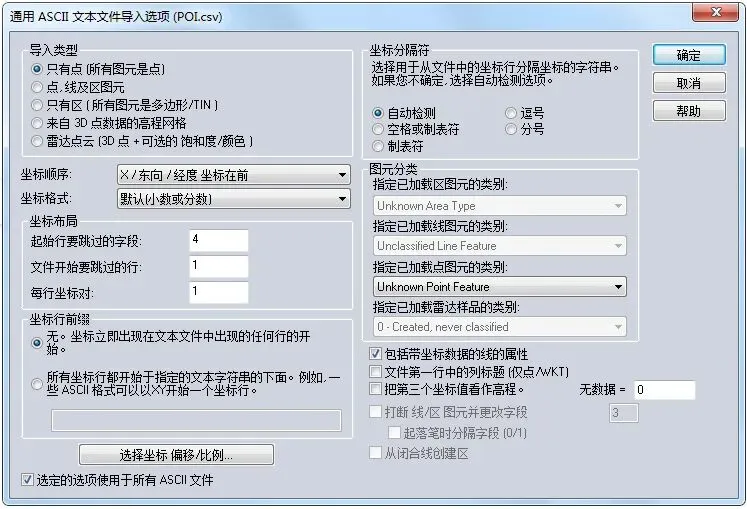 在显示的通用 ASII 文本文件导入选项对话框内,由于 Excel 表中,经度在前纬度在后,所以坐标顺序选择X/东向/经度坐标在前。
