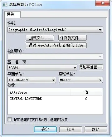 点击确定,在显示的选择投影对话框内,由于数据是经纬度坐标,所以选择 Geographic (Latitude/Longitude),如下图所示。