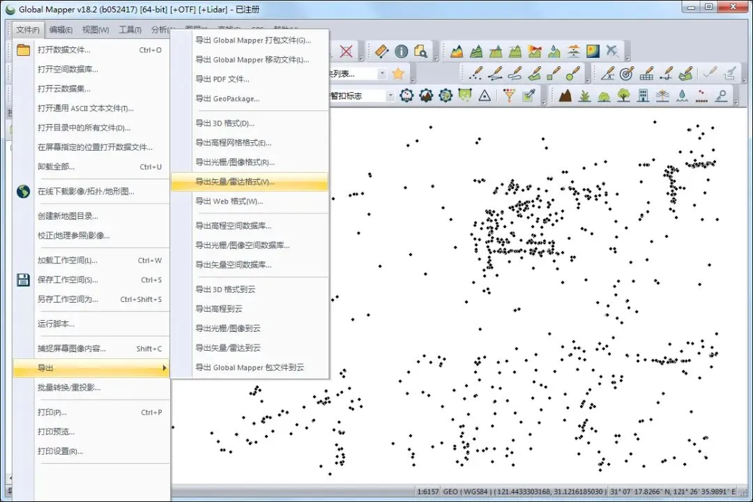 点击菜单栏上的文件,选择“导出\导出矢量/雷达格式”,如下图所示。
