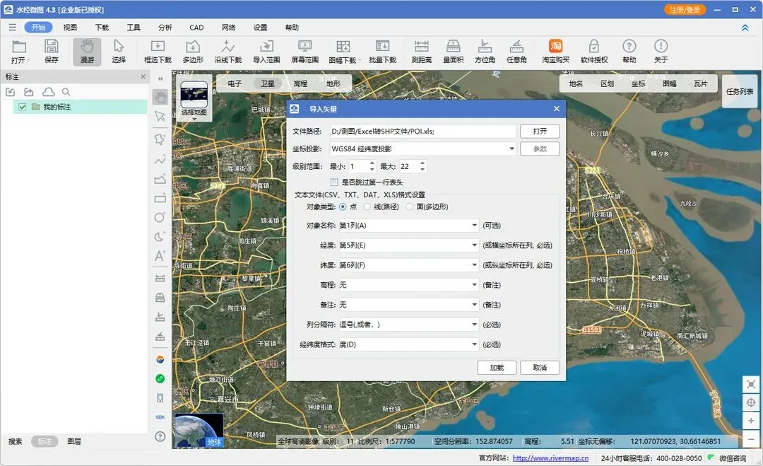 相较于前面的两种方法,微图4操作稍微要简单一些,选择上对应的列导入导出即可,还可以叠加到卫星图上查看。