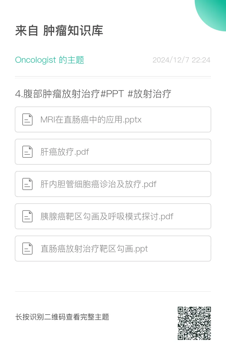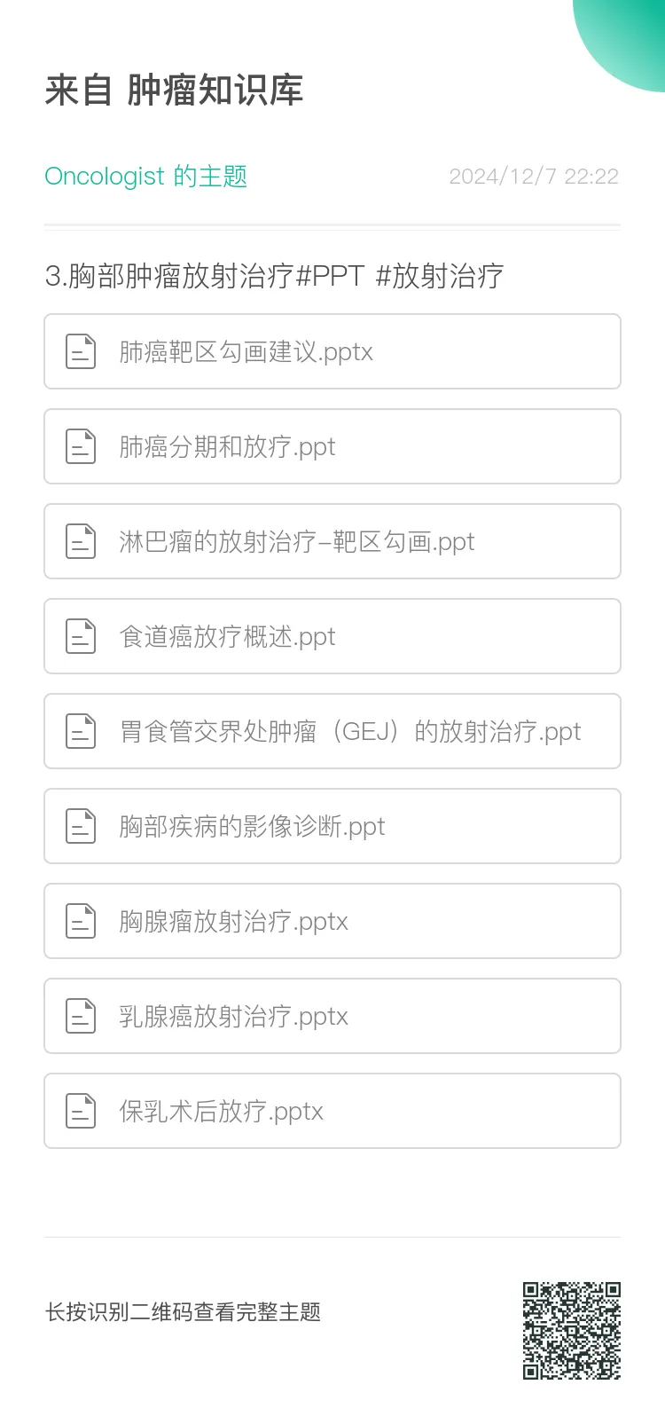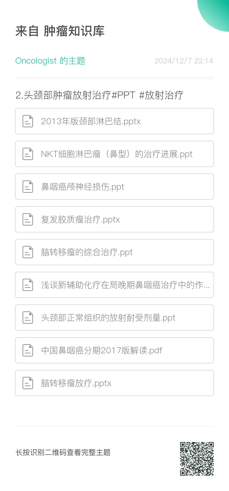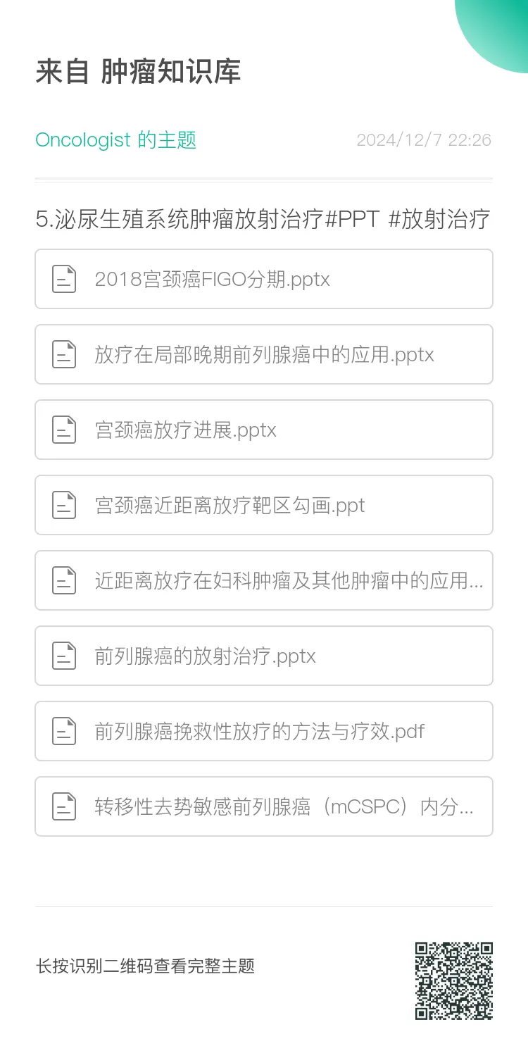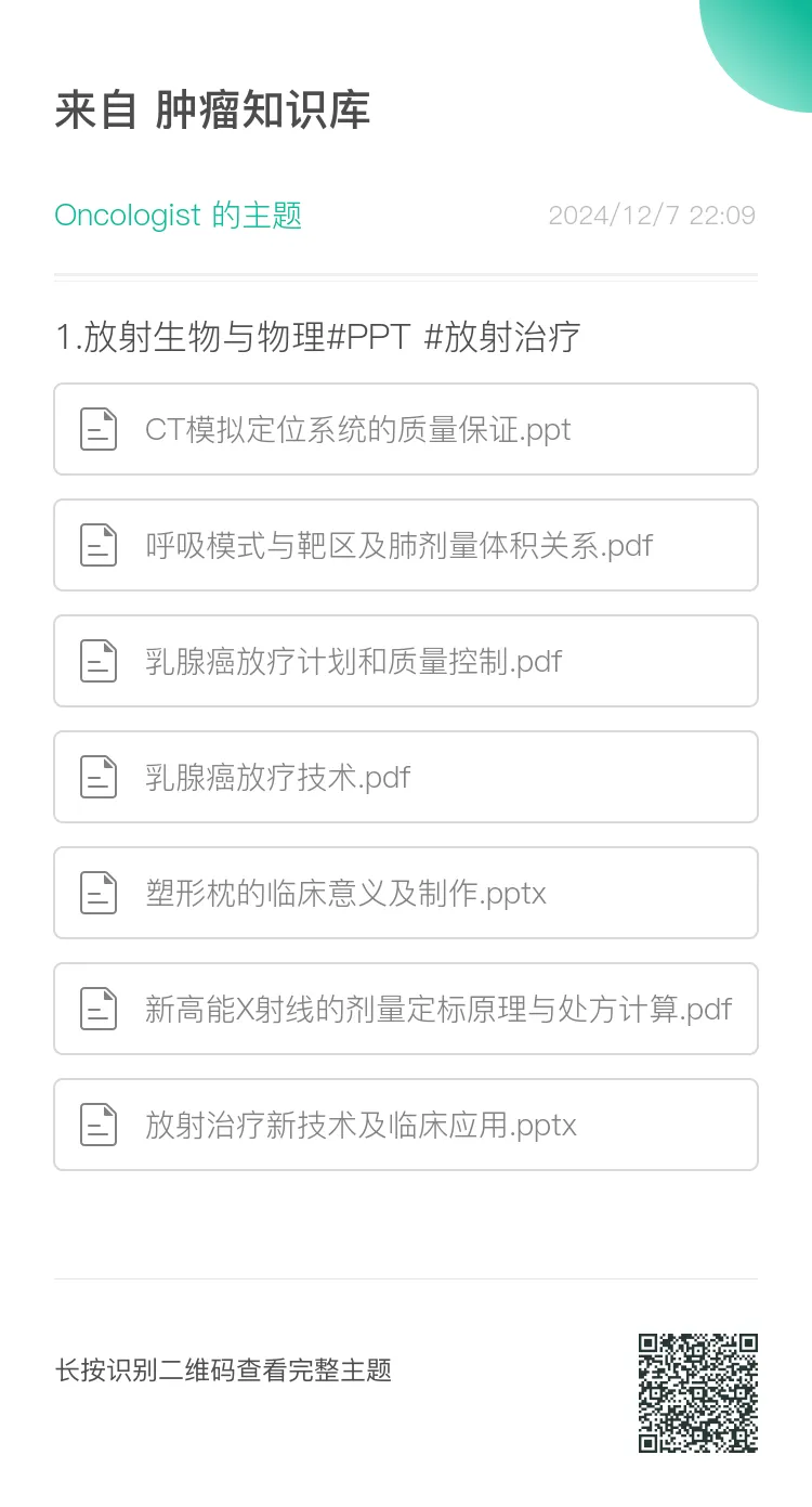 肿瘤知识库:肿瘤内科、放疗科医师的知识天堂,星球内拥有丰富的肿瘤相关资料,包括肿瘤最新治疗指南(NCCN/CSCO/CACA等)、实时更新的会议(ASCO、ESMO、WCLC、ELCC、ASTRO等)、最新系列专家共识、肿瘤放疗规范、最新各癌种PPT、肿瘤系列书籍以及职称考试题库等。