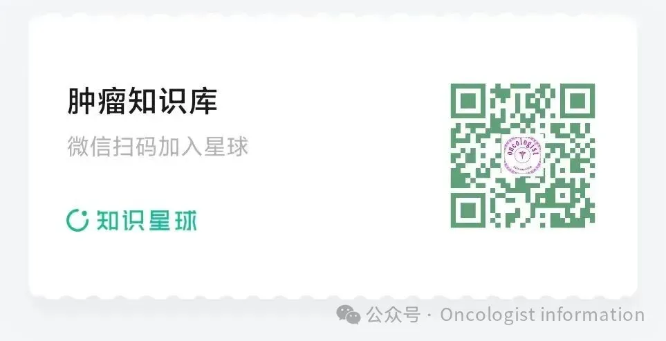 再次声明:本微信公众号所有内容仅供肿瘤学专业同道知识交流及学习,自愿浏览所发表的内容,不代表任何治疗建议和治疗选择。不做任何网络问诊,看病咨询请至当地正规医院就诊。 如有侵权,请及时联系我们删除!