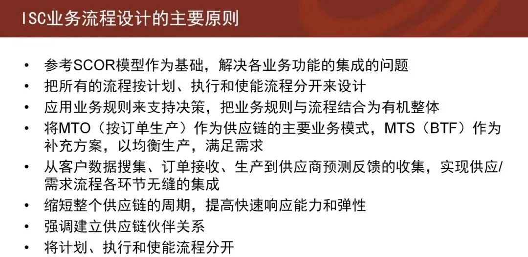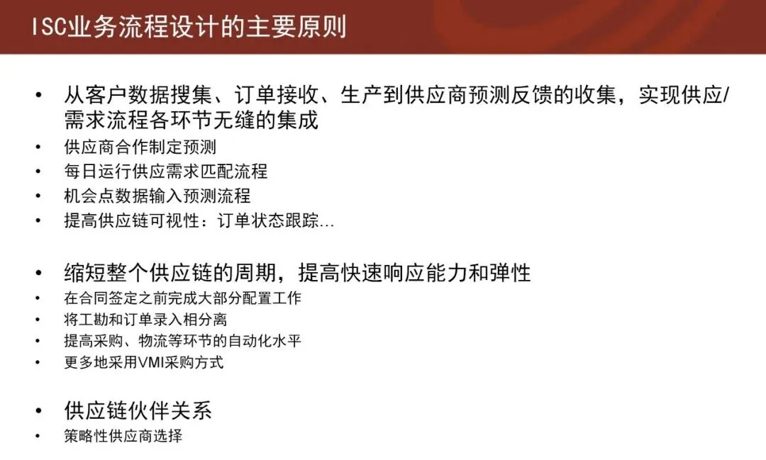 在集成供应链的框架下,有三个基本理念尤为重要:一是以客户为中心,所有流程围绕客户需求展开;二是坚持流程导向,打破职能壁垒,实现端到端的可视与可控;三是建立稳固的伙伴关系,通过信息共享与风险共担,提升整体链路的韧性。
