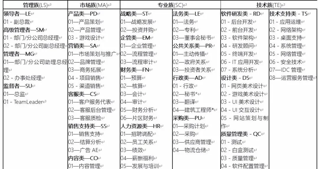 公司员工依据所从事职位,必须且只能选择对应的某一职位类作为职业发展通道;同时为保证管理人员从事管理工作的同时不断提升专业水平,除总办领导以及EVP以外的所有管理人员必须同时选择市场族、技术族、专业族的某一职位类作为其专业的发展通道,走双通道发展。