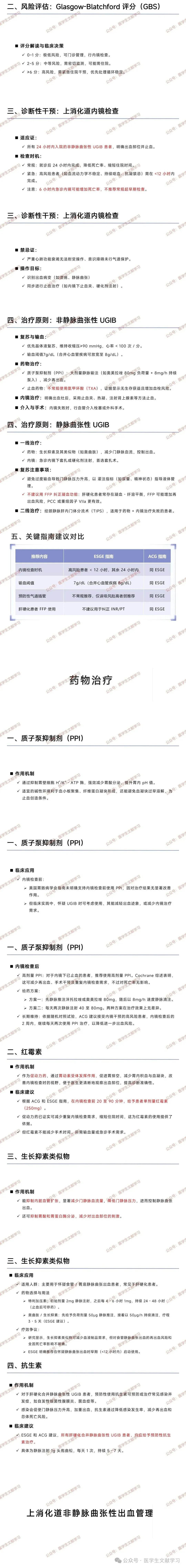 非静脉曲张性 UGIB:复苏与输血方面,优先晶体液复苏,维持收缩压≥90mmHg,心率 < 100 次 / 分,输血阈值 7g/dL(合并心血管疾病可放宽至 8g/dL);药物治疗上,使用大剂量质子泵抑制剂(PPI)(如奥美拉唑 80mg 负荷量 + 8mg/h 持续泵入)以减少再出血,不常规使用氨甲环酸(TXA),因其无生存获益且增加血栓风险;还可采用内镜治疗(明确出血灶后,用止血夹、热凝、注射肾上腺素等方法),内镜失败时行血管介入栓塞或外科手术。