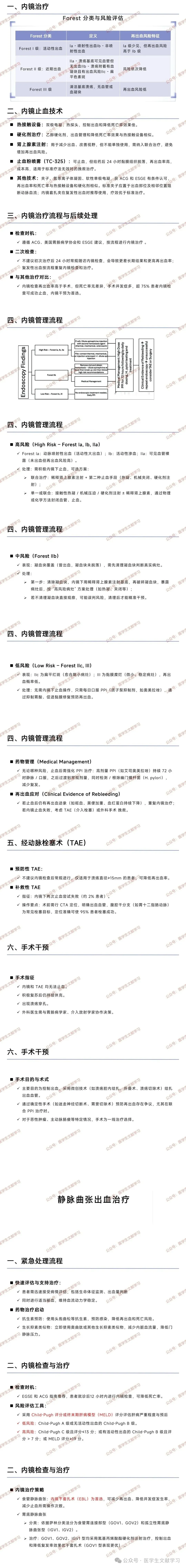 高风险(Forest Ia、Ib、IIa):需积极内镜下止血,可选联合治疗(稀释肾上腺素注射 + 第二种止血手段,如热凝、机械夹闭、硬化剂注射),或单一 / 联合使用接触性热凝、机械压迫、硬化剂注射 ± 稀释肾上腺素,通过物理或化学方法封闭血管、止血。