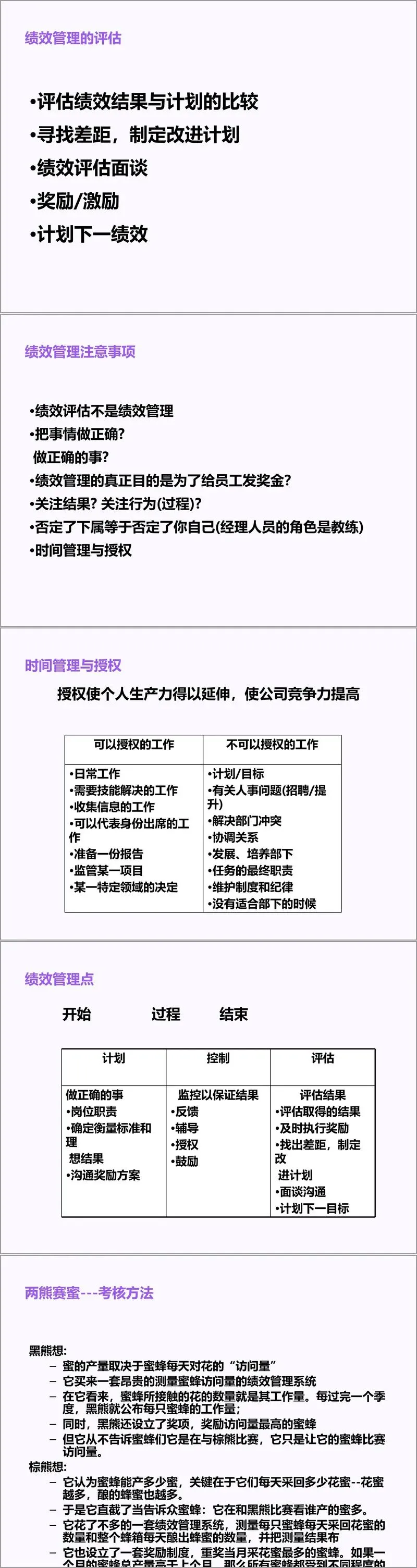 文件开篇明确了绩效管理的核心逻辑,将其定义为 “目标设定 - 执行 - 评估 - 奖励” 的闭环流程,强调绩效管理并非单纯的考核打分,而是通过目标对齐、过程辅导、结果应用实现员工与组织共同成长。绩效管理需兼顾 “做正确的事” 与 “把事情做正确”,既要聚焦战略目标落地,又要关注行为过程规范,管理者需承担教练角色,通过有效授权与时间管理延伸个人生产力。文件特别区分了可授权与不可授权的工作边界,为管理者提升管理效率提供了明确参考。