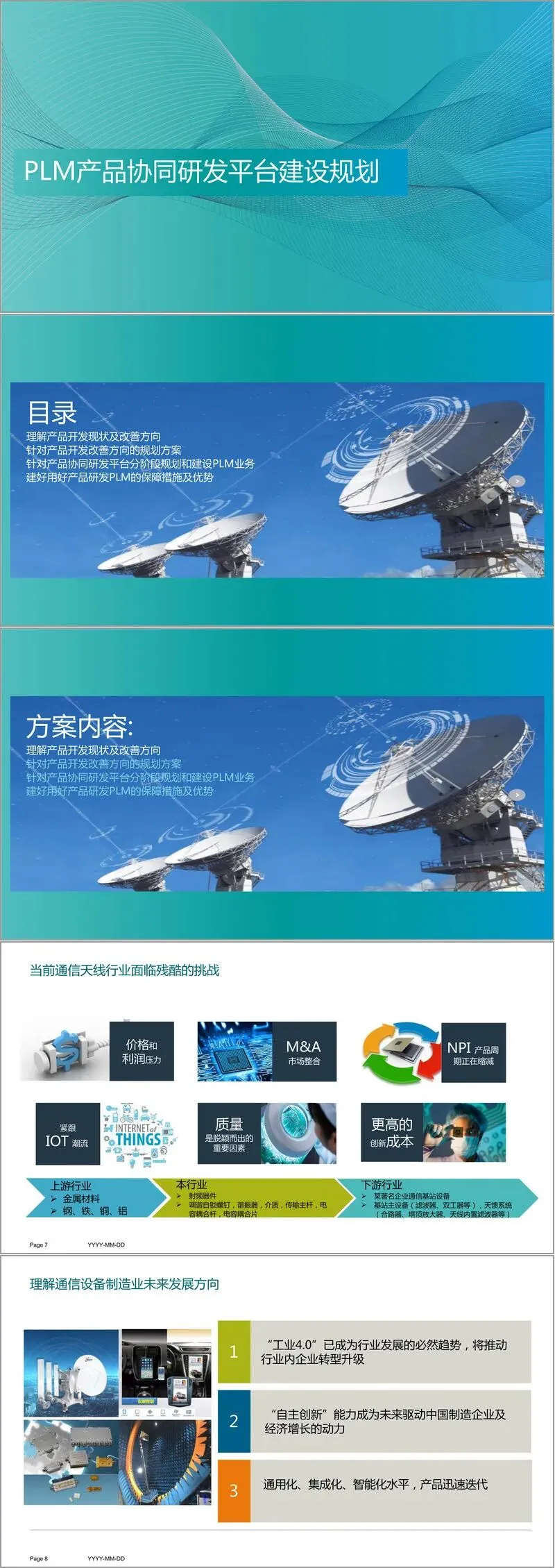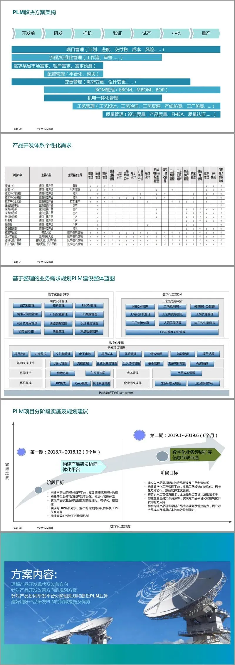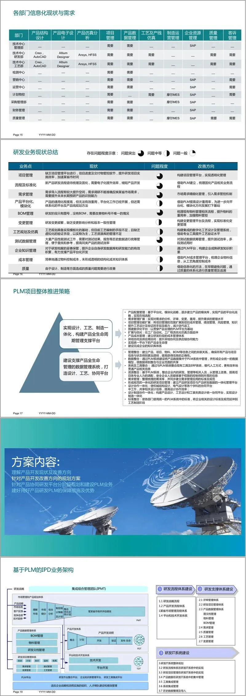 本方案为通信设备制造企业提供了一套完整的PLM(产品生命周期管理)系统建设规划,从现状分析到实施路径,全面阐述了如何通过信息化手段提升产品研发协同效率。该方案基于对通信天线行业特点的深入分析,结合西门子Teamcenter平台的优势,提出了符合企业实际需求的PLM系统建设方案。