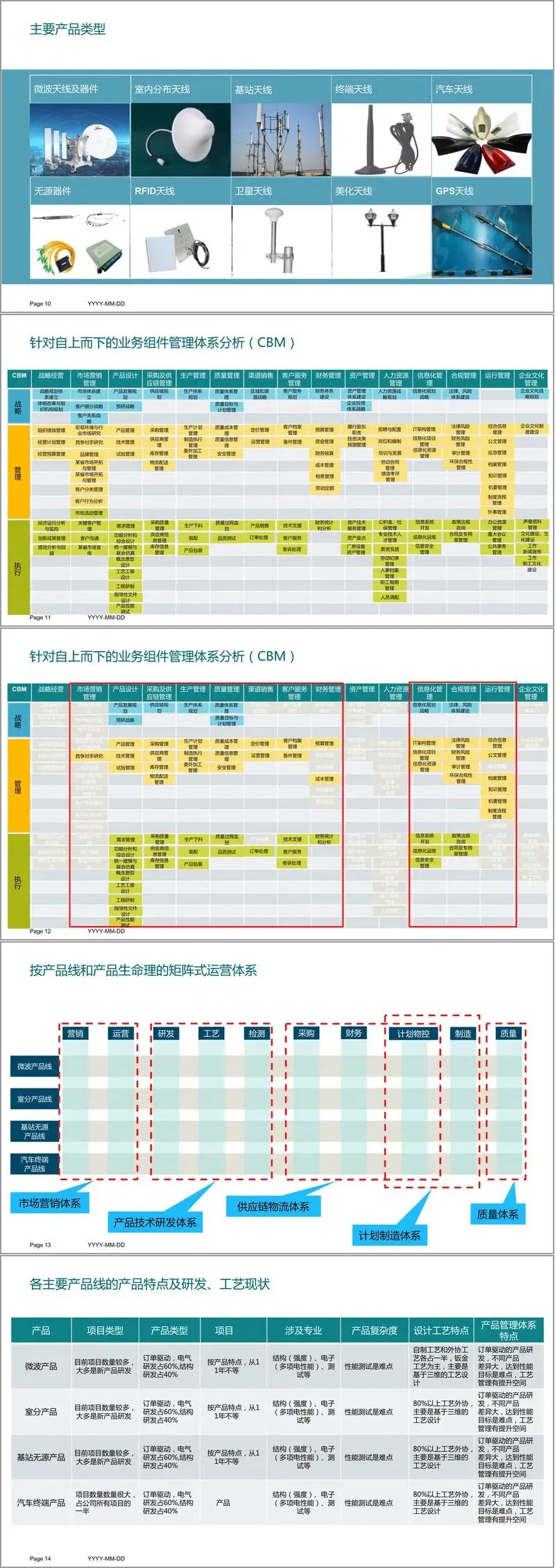 通过对企业产品开发现状的分析,方案识别出四大类主要产品:微波天线及器件、室内分布天线、基站天线和汽车终端天线,每类产品都有其独特的研发特点。例如,微波天线研发周期较长,需要复杂的性能测试;而汽车终端天线项目数量大,更新速度快。目前企业在产品开发过程中主要存在项目管理不透明、流程标准化不足、需求管理不完善、平台化程度不高等问题。