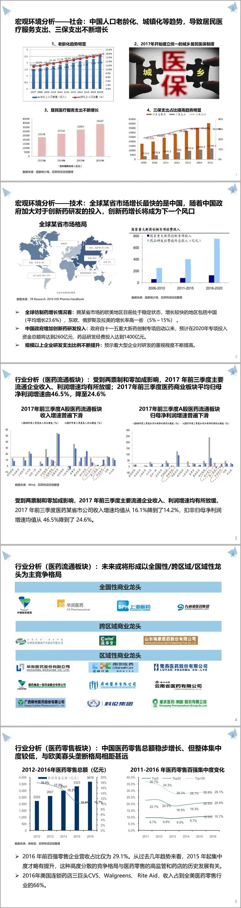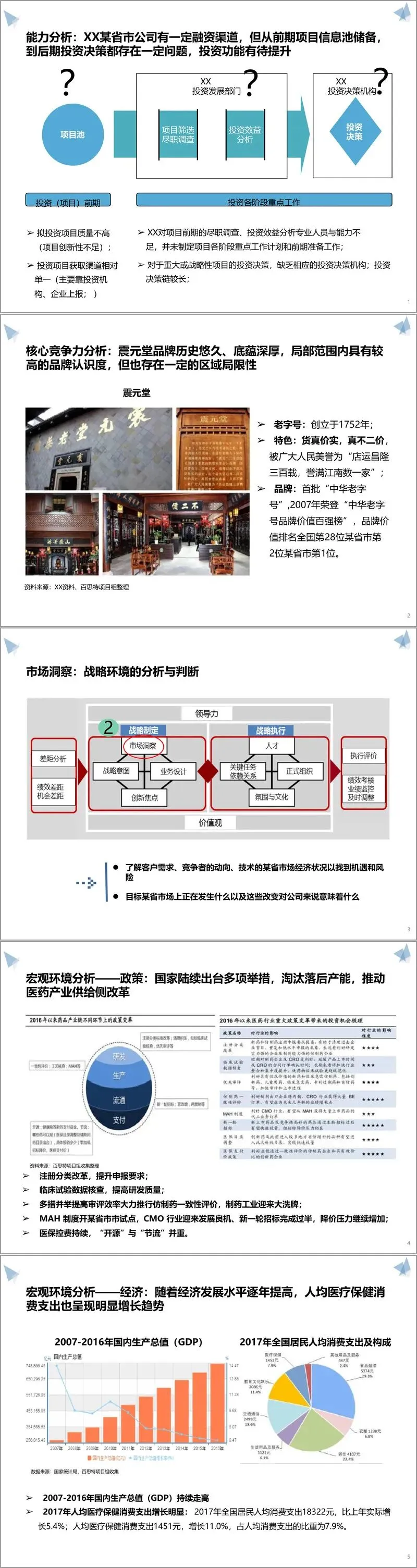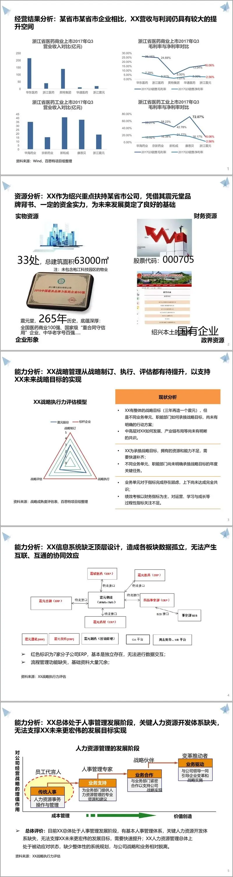 方案开篇通过差距分析明确核心问题。从经营数据来看,XX 近三年资产、销售额与净利润稳步增长,但与省内同行相比,营收与利润仍有较大提升空间,且应收账款周转、存货管理等指标需重点优化。资源层面,企业拥有 265 年历史的 “震元堂” 中华老字号品牌、政府扶持资源及完整产业链布局,但存在战略管理体系不完善、信息系统孤立、人力资源开发不足、投资功能薄弱等短板。外部环境方面,医药行业面临政策密集调整,两票制、仿制药一致性评价等政策推动产业洗牌,同时大健康市场崛起、人口老龄化等带来发展机遇,行业集中度提升成为必然趋势。