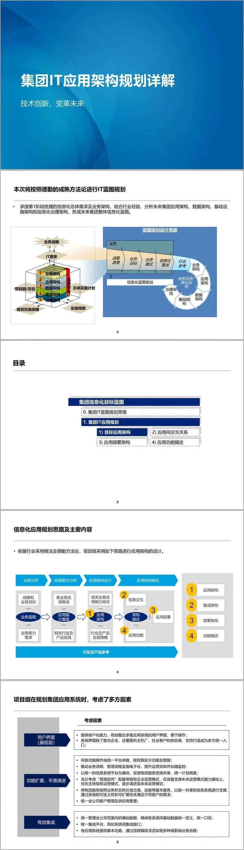 本规划方案基于德勤成熟方法论,为集团构建了一套完整的IT应用架构蓝图。该方案从业务战略出发,通过系统化的架构设计方法,规划了未来集团信息化建设的整体框架和实施路径。
