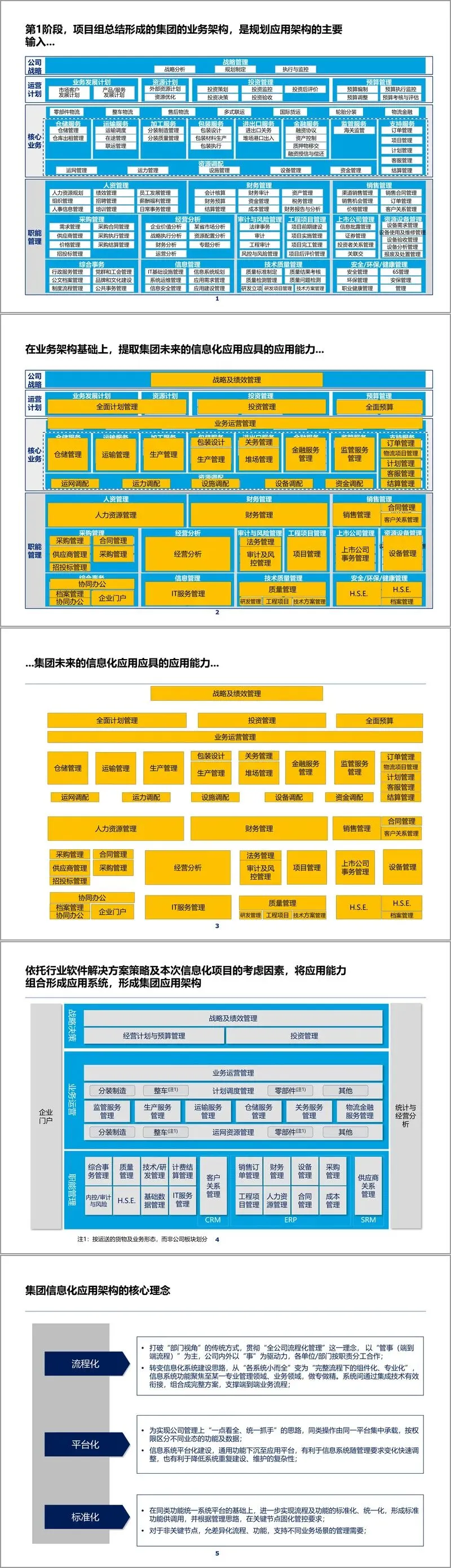 在应用架构规划方面,方案展现了清晰的逻辑脉络。规划团队首先深入分析了集团的业务架构,从战略管理、业务运营到职能支持,全面梳理了各业务领域的能力需求。基于这些业务能力需求,结合行业软件解决方案策略,规划出了集团未来的目标应用架构。这一架构打破了传统的"部门视角",贯彻"全公司流程化管理"理念,实现了从"各系统小而全"到"完整流程下的组件化、专业化"的重要转变。