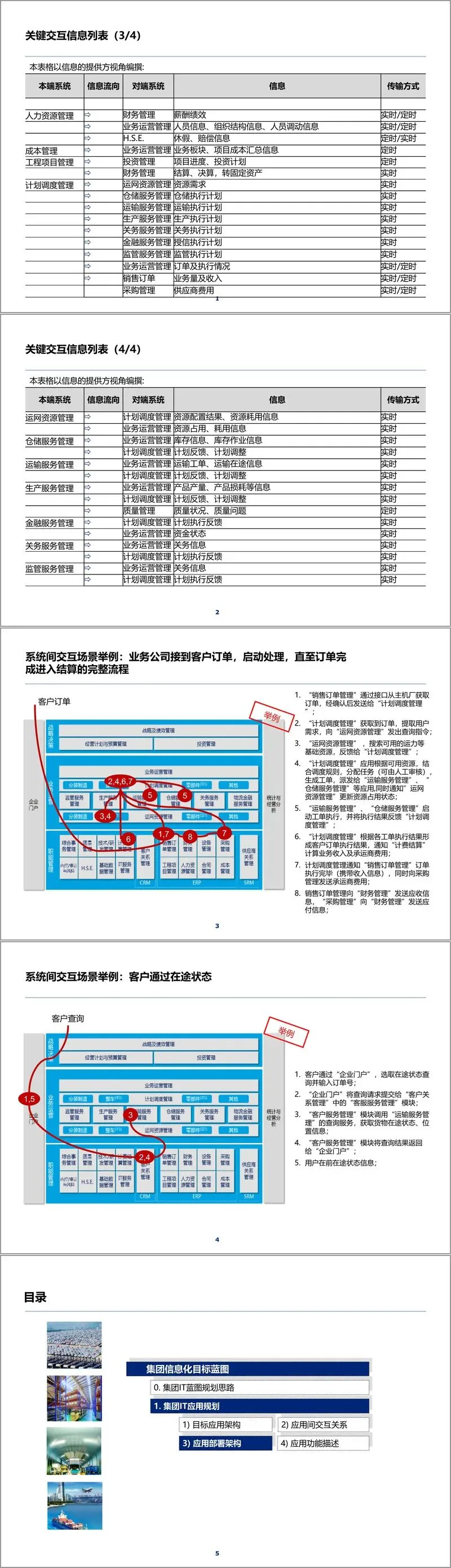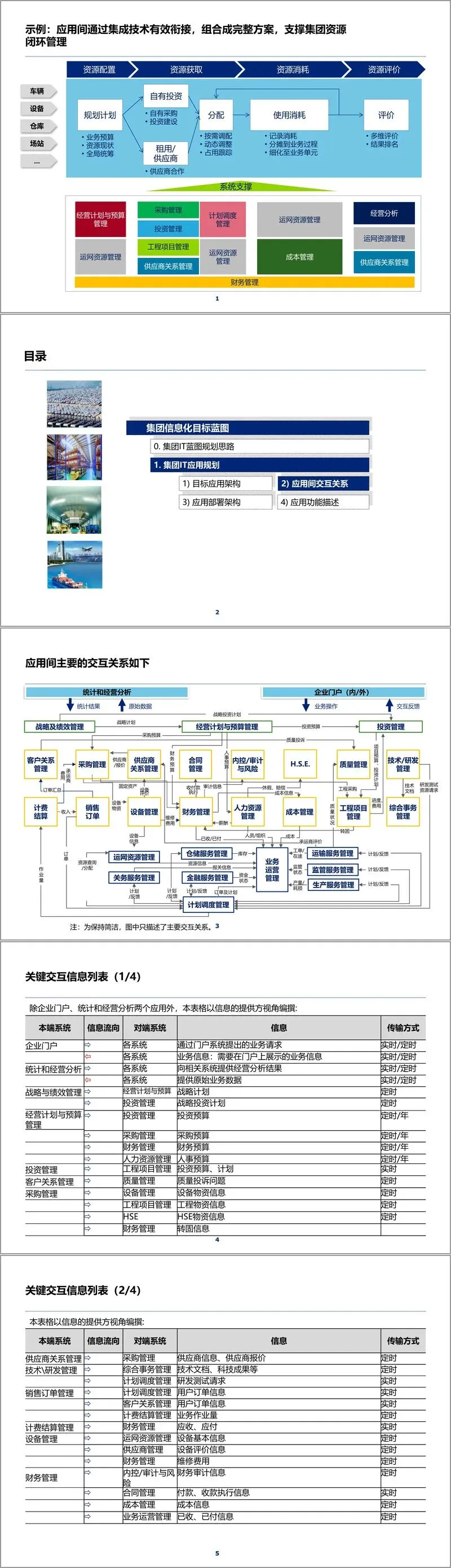 方案详细阐述了各应用系统间的交互关系。通过绘制应用交互图和信息流分析,清晰地展示了从战略投资计划到业务执行,再到财务核算的完整信息链条。特别值得关注的是,方案还通过具体的业务场景示例,如"客户订单处理流程"和"在途状态查询流程",生动说明了系统间如何协同工作以支持端到端的业务流程。