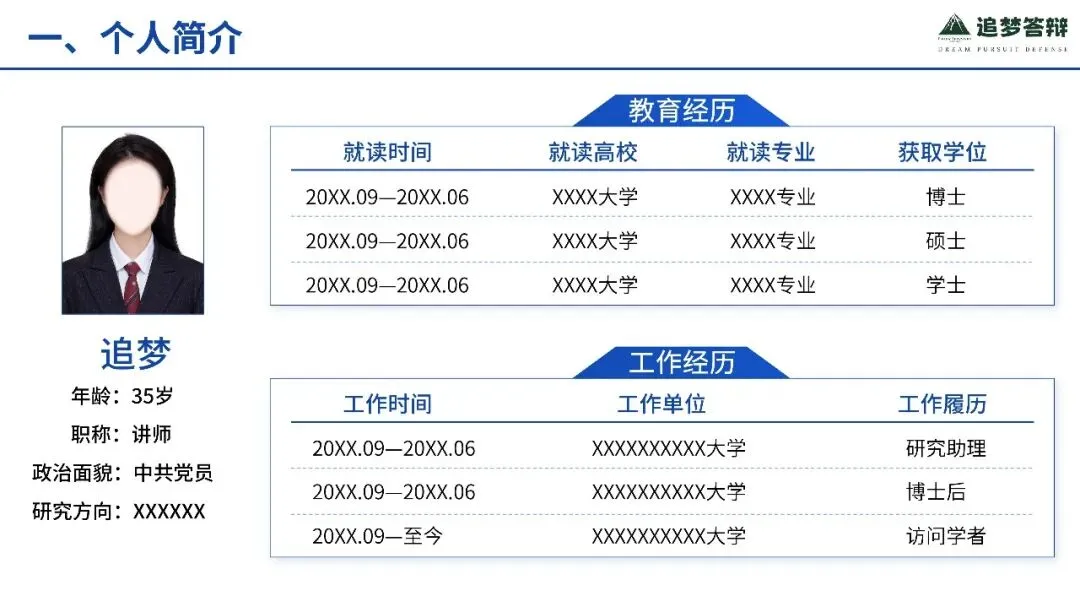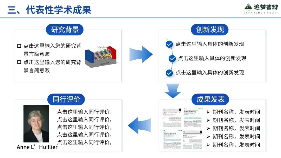 这套模板由具有多年评审经验的专业团队联合设计,紧扣职称评审核心要点,内容结构科学合理——涵盖个人简介、工作业绩、科研成果、未来规划等关键模块,逻辑清晰、重点突出;视觉风格简洁专业,配色稳重、排版规范,既符合学术场合的严谨性,又具备良好的展示效果。