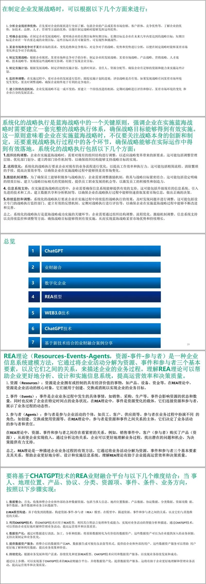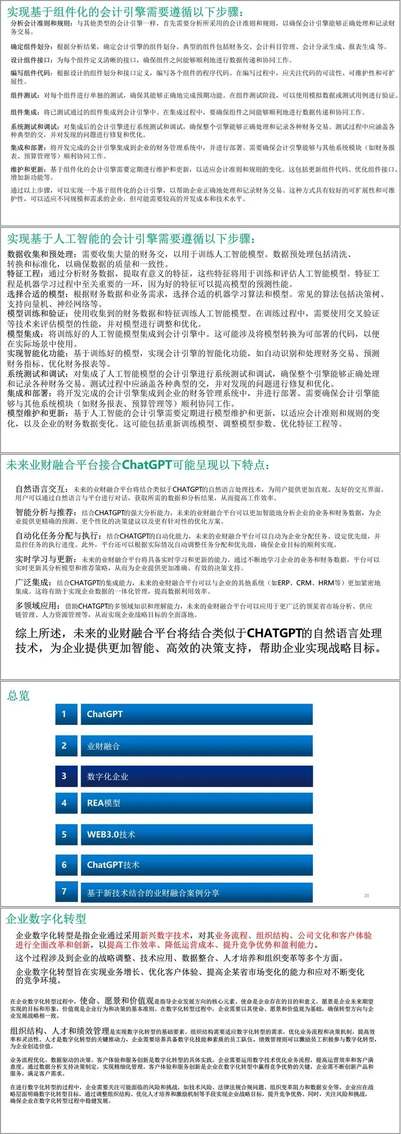 本文件构建了一套以 ChatGPT、Web3.0技术为核心支撑,融合 REA 模型(资源 - 事件 - 参与者)的数字化转型业财融合解决方案,旨在打破传统业财分离壁垒,实现业务与财务的深度协同、智能决策与数据资产化,为企业数字化转型提供全景式指导。方案兼具理论深度与实践可行性,涵盖技术应用、模型构建、流程优化、案例落地等多个维度,形成了 “技术赋能 - 模型支撑 - 场景落地 - 生态构建” 的完整逻辑链。