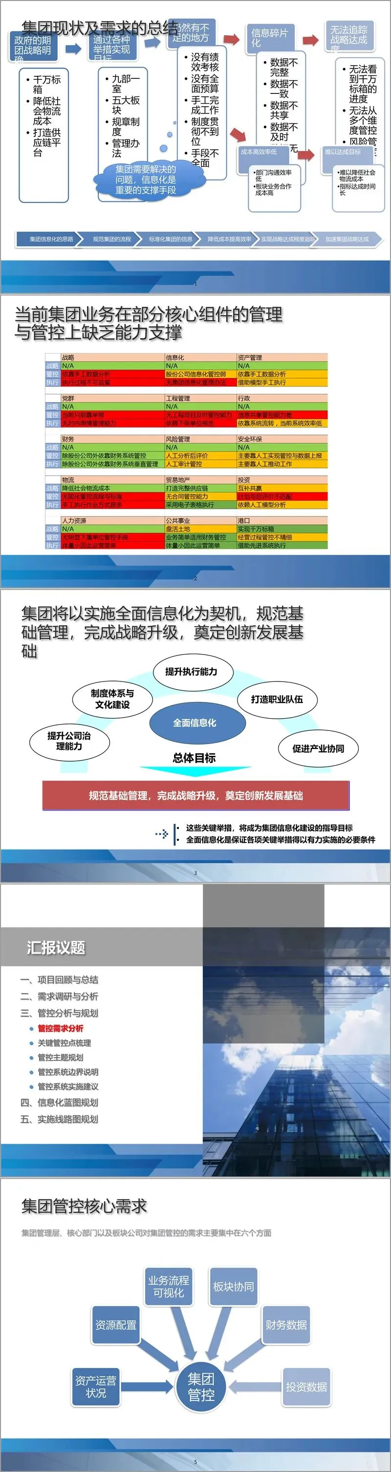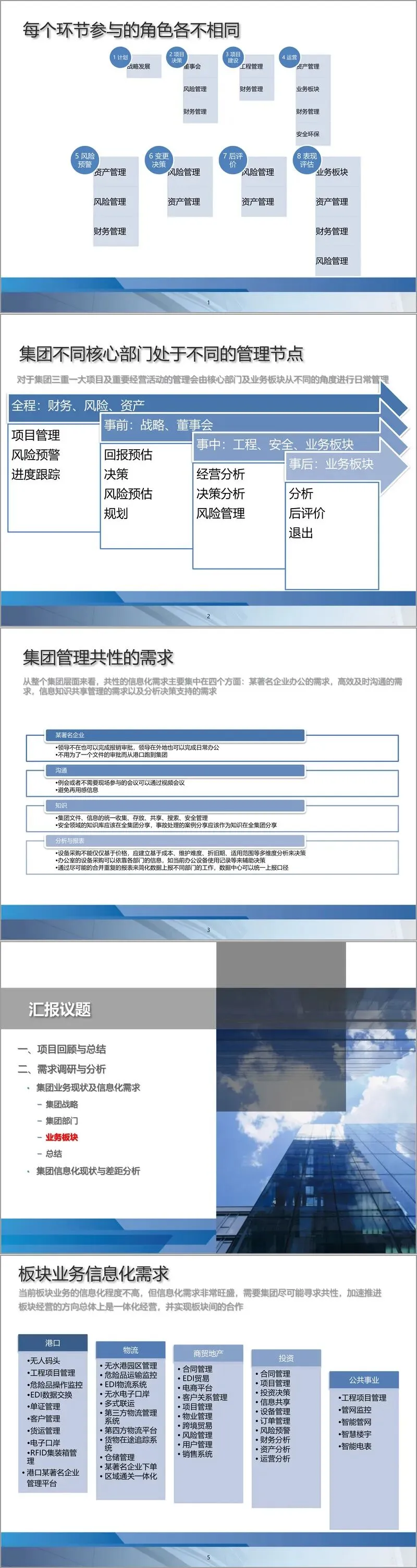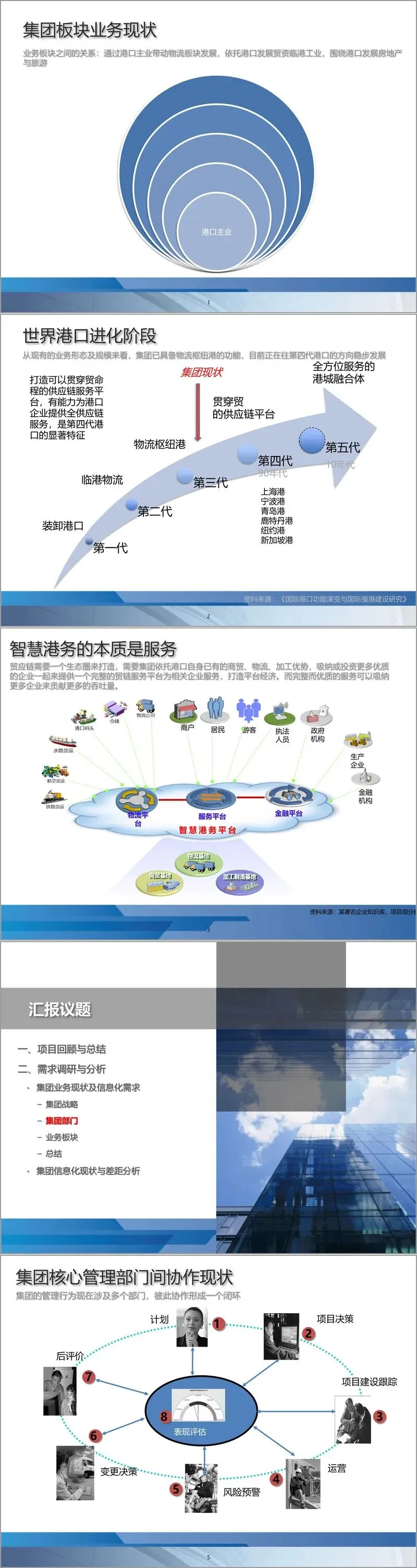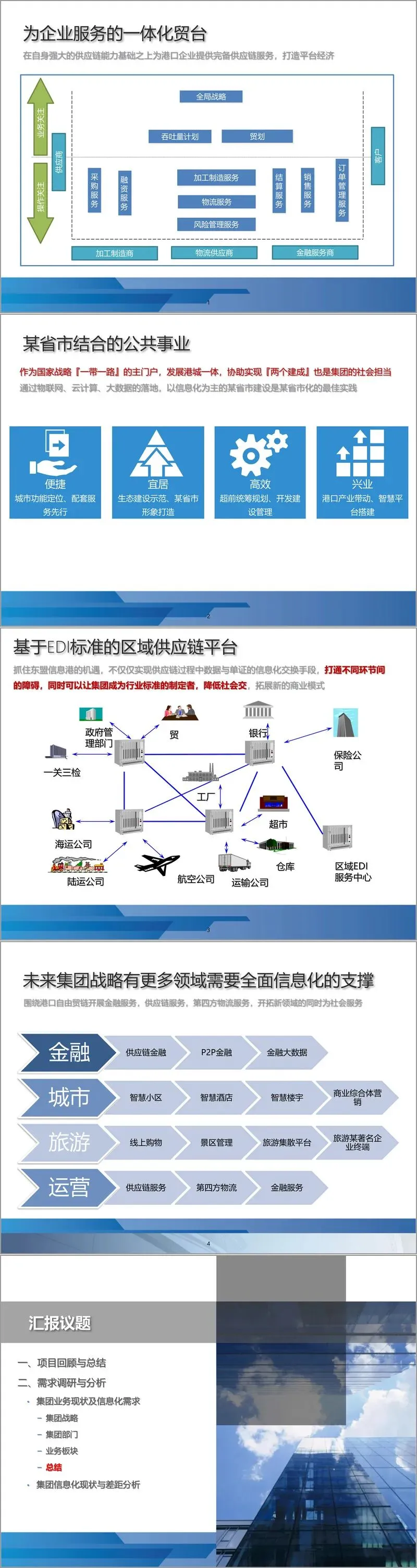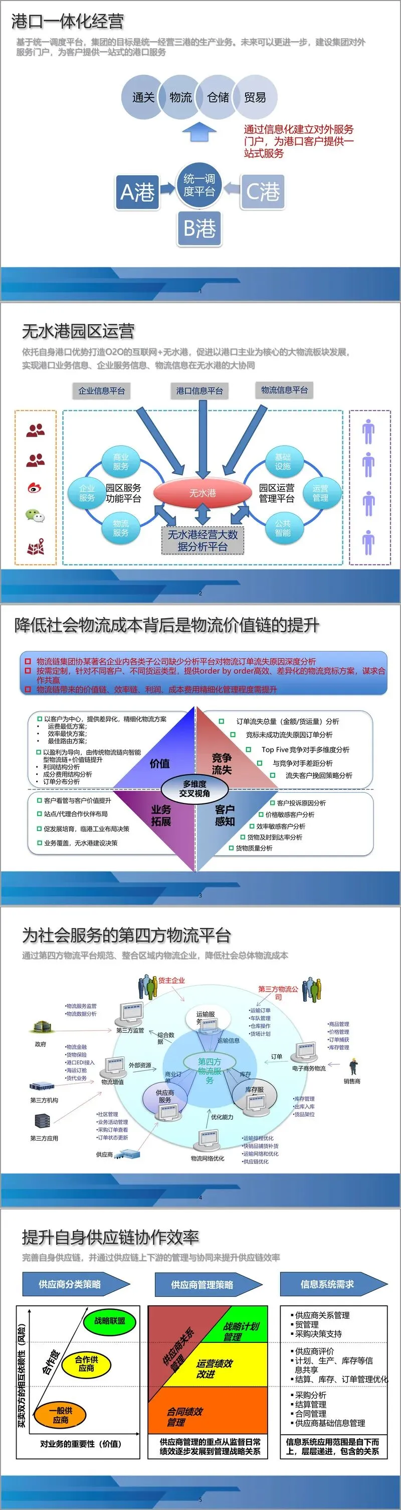 在项目背景分析部分,方案首先明确了集团的战略定位:立足西南,面向东南亚,以降低区域性物流成本为己任,为区域经济发展提供全程物流服务。集团业务板块包括港口主业、物流、商贸、地产等多个领域,各板块之间通过港口主业带动协同发展。从业务形态来看,集团已具备物流枢纽港的功能,正在向第四代港口的方向发展,致力于打造贯穿贸易全过程的供应链服务平台。