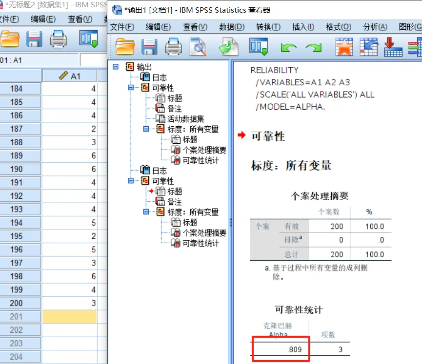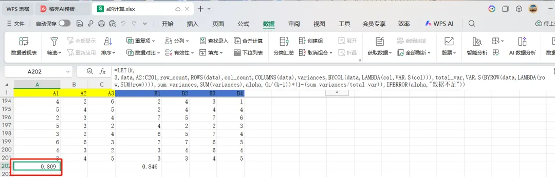 =LET( k, 3, data, A2:C201, row_count, ROWS(data), col_count, COLUMNS(data), variances, BYCOL(data, LAMBDA(col, VAR.S(col))), total_var, VAR.S(BYROW(data, LAMBDA(row, SUM(row)))), sum_variances, SUM(variances), alpha, (k/(k-1))*(1-(sum_variances/total_var)), IFERROR(alpha, "数据不足"))