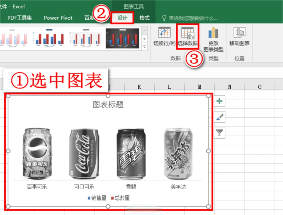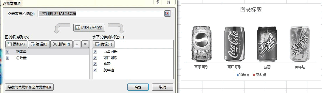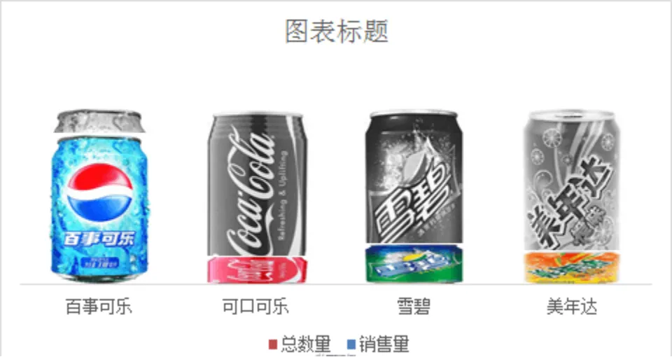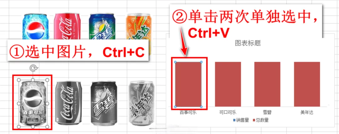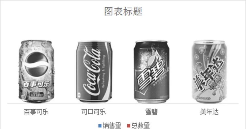 选择第一个柱体“百事可乐”对应的饮料图片,由于我们需要先设置图表的灰色背景,所以这里选中灰色的“百事可乐”图片,按Ctrl+C复制;再点击两次!!!“百事可乐”柱体,即单独选中,按Ctrl+V粘贴。如下图: