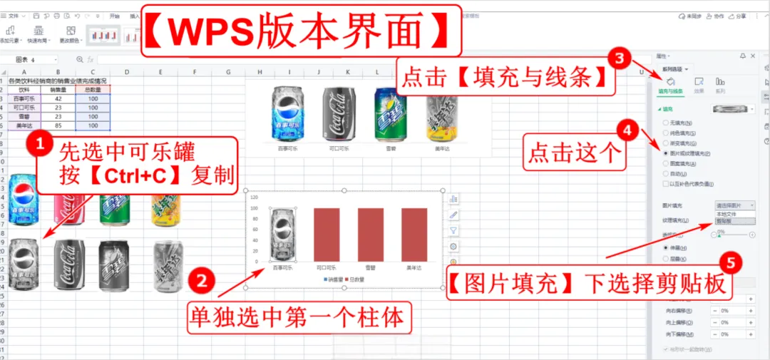 WPS版本先去选择可乐罐复制之后,点击第一个柱子,再去点击右边的填充与线条,下面的图片或纹理填充,下面去选择剪切板哦,如下图: