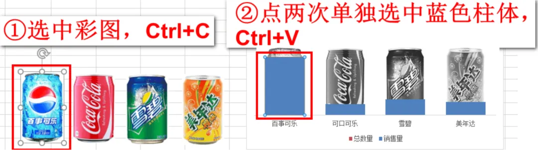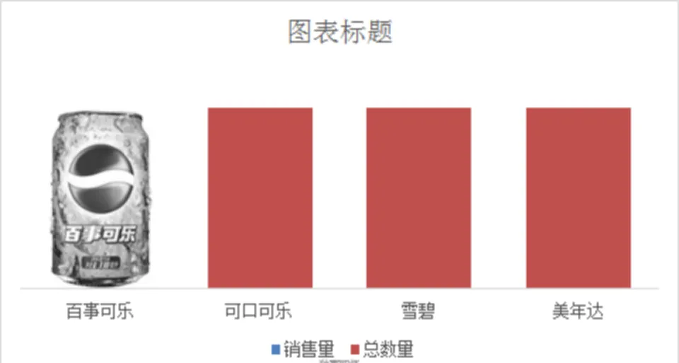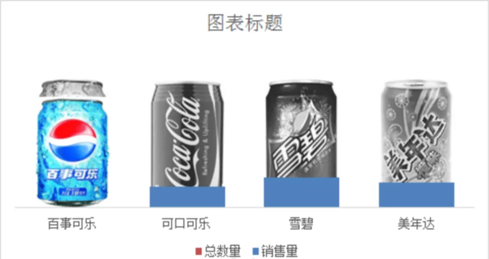 就像我们上面复制灰色图片一样,依然是先选中彩色图片,比如“百事可乐”,Ctrl+C复制,再选中图表中对应的柱体“百事可乐”的蓝色柱体!!,注意点击两次!!!单独选中蓝色柱体哦,选中后点击键盘Ctrl+V进行粘贴。如下图: