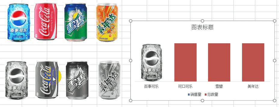 下面我们一一将其他灰色的饮料图片,都粘贴到图表相应的柱子上,注意选中单独的柱体要点两次!!!如下动图: