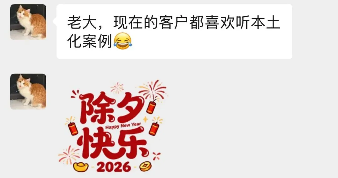 他很快回:“老大,现在的客户都喜欢听本土化案例。”后面跟了个捂脸笑的表情。