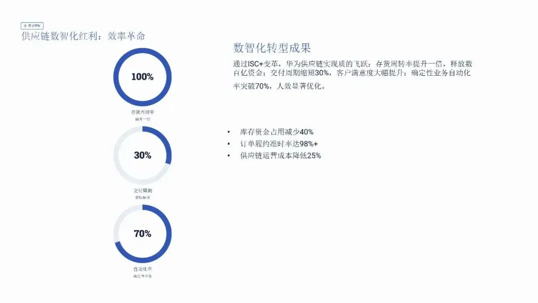 华为在2024年通过其全球供应链管理体系的数智化重构,实现了显著的经营突破与效率革命。公司年度营收达8621亿元人民币,同比增长22.4%,其背后是ISC+(集成供应链Plus)变革带来的根本性提升:存货周转率提升一倍,交付周期缩短30%,确定性业务自动化率突70%。转型的核心在于构建了以“灵鲲”数智云大脑为全局指挥中枢、以“灵蜂”智能引擎为一线执行单元的主动型供应链系统,并通过覆盖“对象-过程-规则”的三层数字孪生底座,实现了从被动响应到主动预测、从经验决策到数据智能的范式升级。
