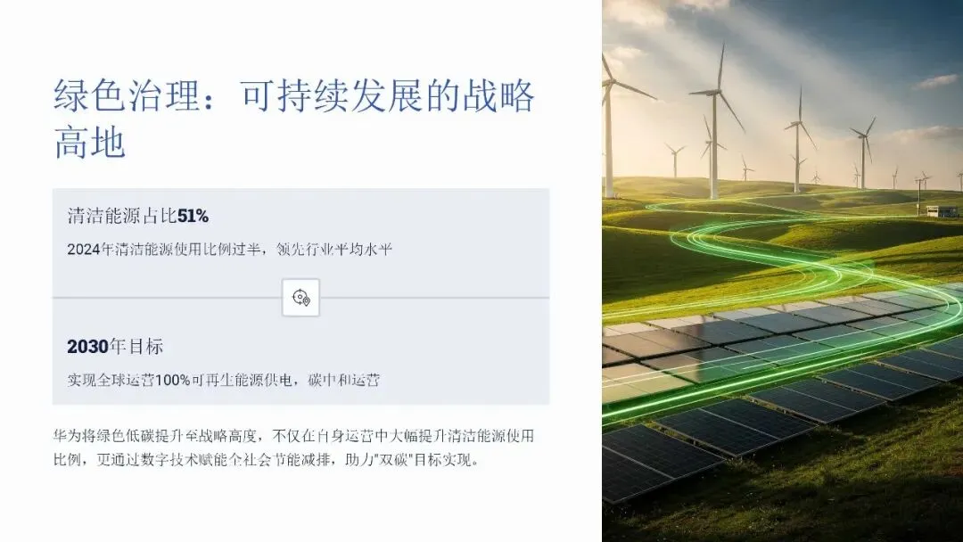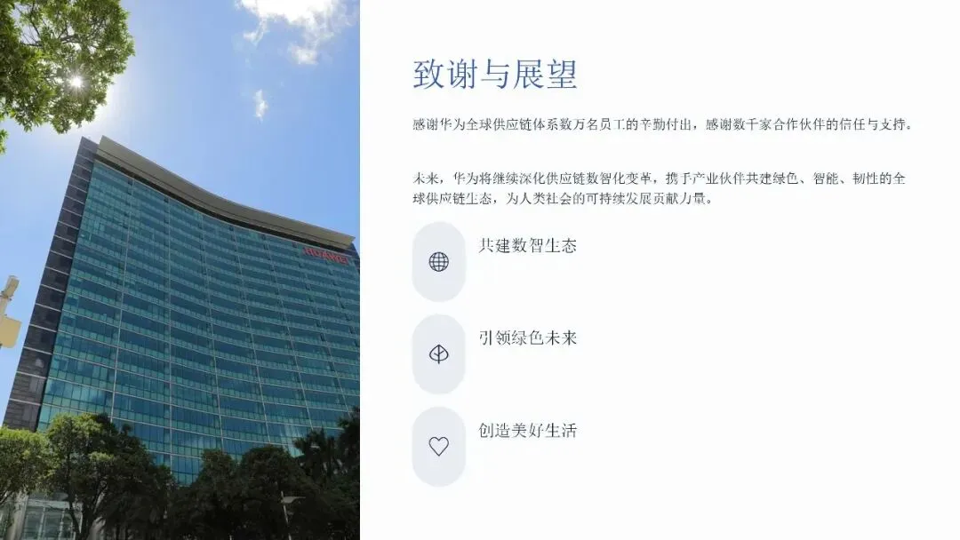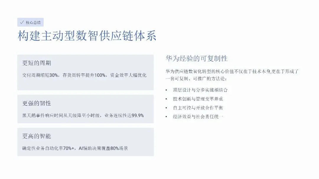 面向未来,华为将其供应链体系定位为绿色、智能、韧性的生态核心。公司将绿色治理提升至战略高度,清洁能源使用占比已达51%,并推动超过90%的核心供应商承诺科学碳目标(SBTi)。通过盘古大模型的AI Native能力深度融合,在质量检测、路径优化等场景实现效率的数十倍提升。最终,华为形成了一套可复制的方法论——顶层设计与分步实施相结合、技术创新与管理变革并重,旨在携手产业伙伴共建可持续发展的全球供应链生态,实现经济效益与社会责任的统一。