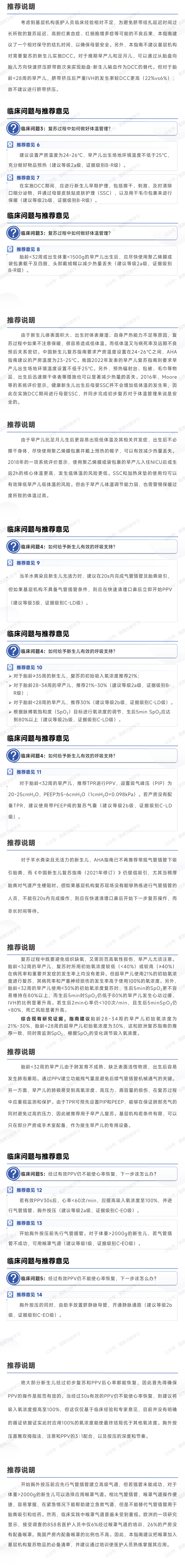 对于胎龄 < 32 周的早产儿,推荐 TPR 进行 PPV,设置吸气峰压(PIP)为 20~25 cmH₂O,PEEP 为 5~6 cmH₂O(1 cmH₂O=0.098 kPa)。若产房没有配备 TPR,建议使用带 PEEP 阀的复苏气囊(建议等级 2b 级,证据级别 C-LD 级)。
