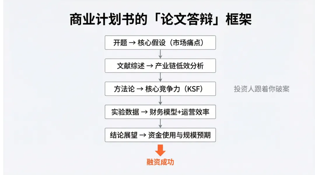 在华橙咨询,我们辅导创业者写BP时,遵循的是一套逻辑严密的 “论文答辩”框架 :