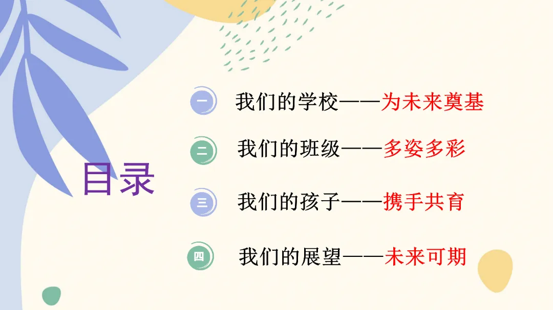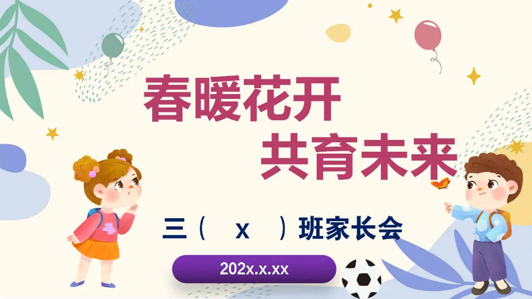 三年级下学期开学家长会课件PPT:“春暖花开,共育未来”(电子版可编辑,有发言稿,有暖场视频),部分内容由PPT展示可见。