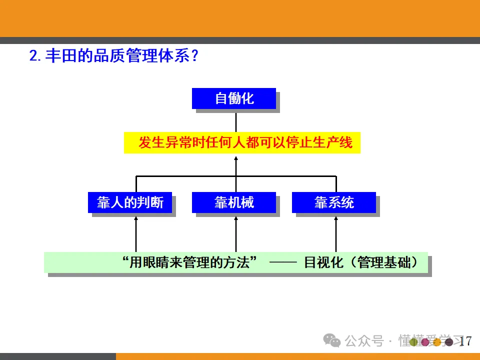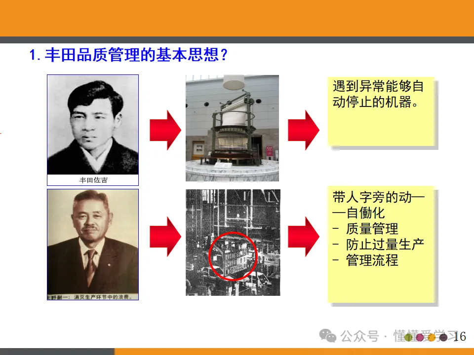 - 自动停止的机器:丰田生产方式强调设备的智能化和自动化,一旦检测到异常或不良品,机器会自动停止,防止不良品的继续产生。这种思想体现了对品质的极致追求和对生产过程的严格控制。