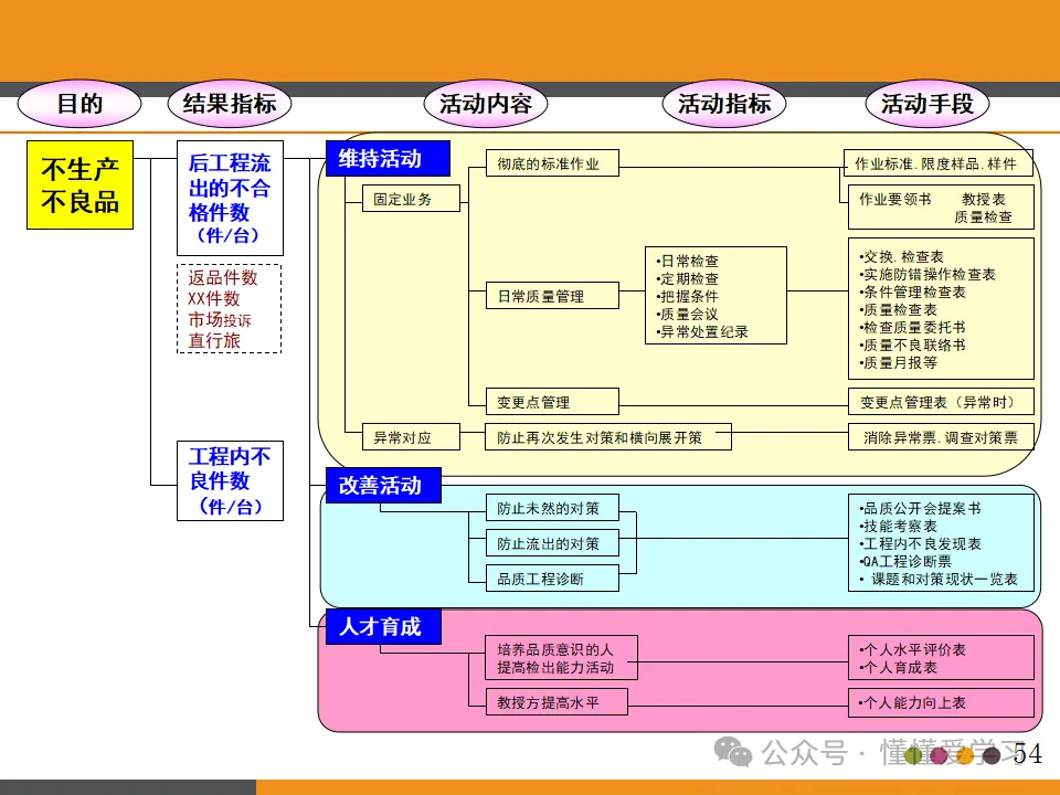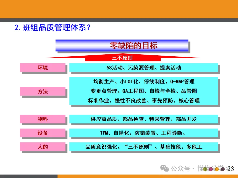班组品质管理体系围绕“零缺陷”目标构建,具体包括三不原则、环境管理、均衡生产、更改点管理、标准作业等方面。班组长需要制定详细的品质管理计划和标准,明确各项品质指标和要求,确保员工能够按照标准进行作业,并对生产过程中的品质问题进行及时的处理和改进。