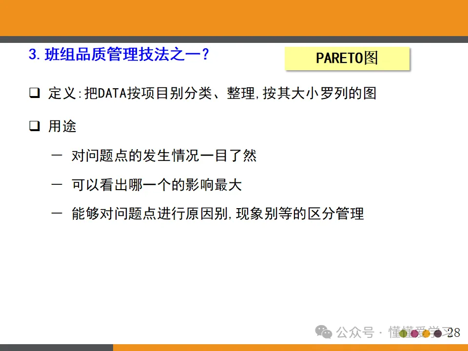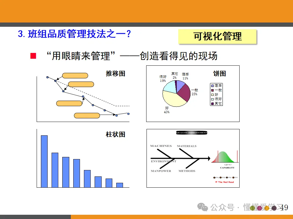班组在实施品质管理时,可采用多种技法,如检查表、工程诊断、Q-MAP、PARETO图、变更点管理、标准作业管理、技能认证以及可视化管理等。这些技法能够帮助班组长更好地了解生产过程中的品质状况,及时发现问题并采取相应的措施进行改进,从而提升产品的品质和客户的满意度。