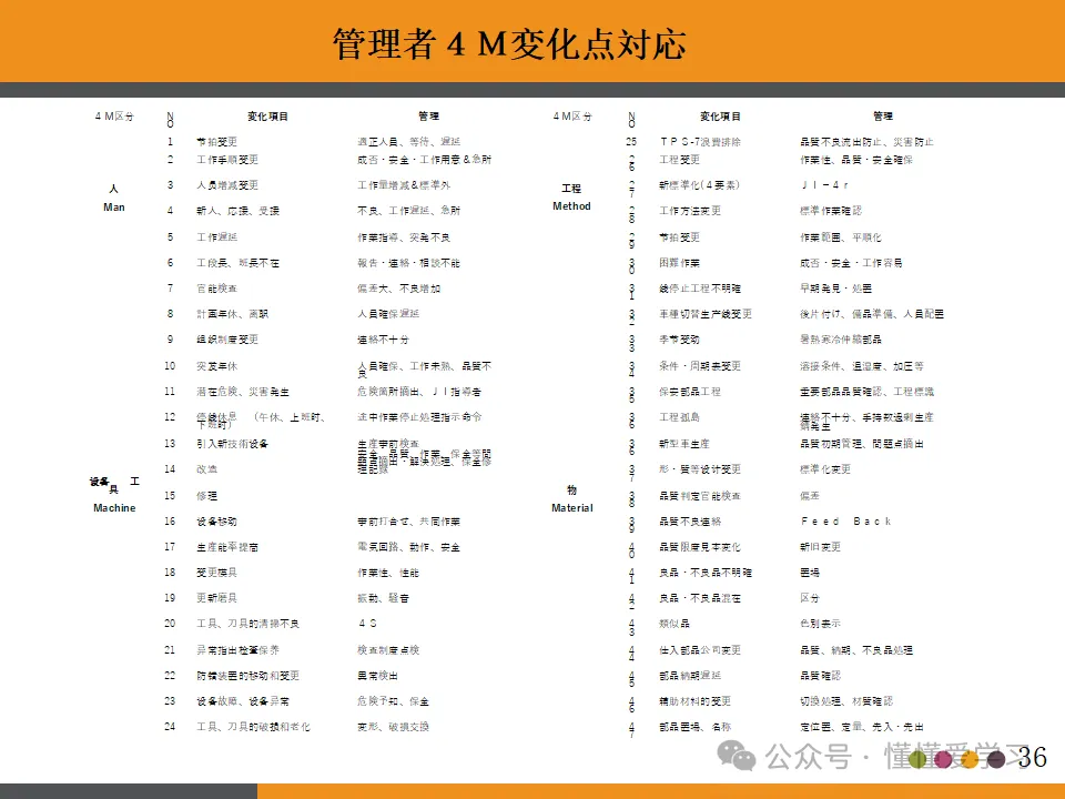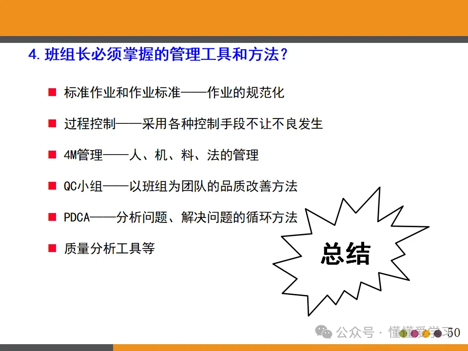 为了有效管理班组,班组长需掌握以下工具和方法:标准作业和作业标准、过程控制、4M管理(人、方法、材料、机器)、QC小组、PDCA循环以及质量分析工具等。这些工具和方法能够帮助班组长更好地了解生产过程中的各种问题,制定有效的解决方案,并进行持续改进,从而提升班组的整体效能和产品的品质。