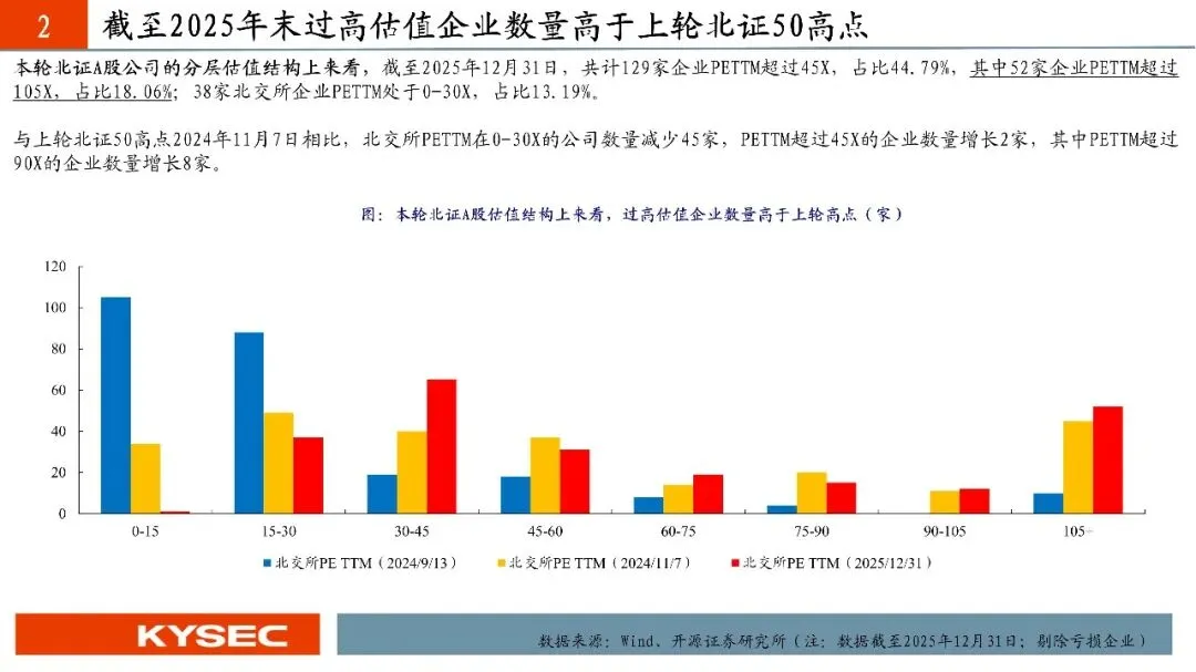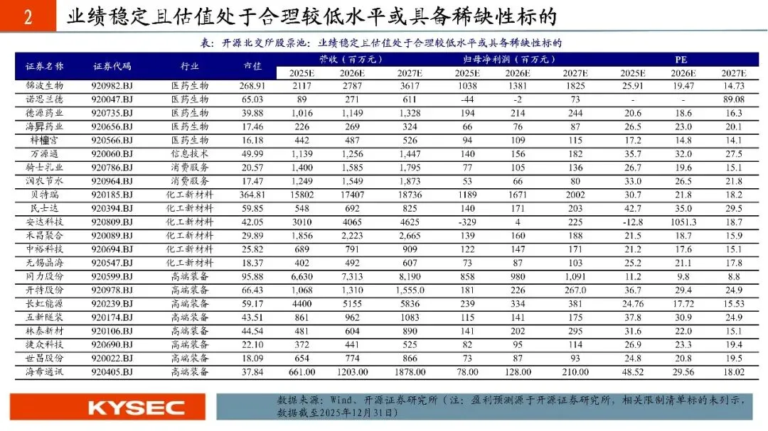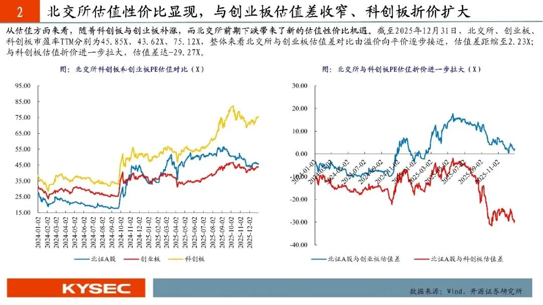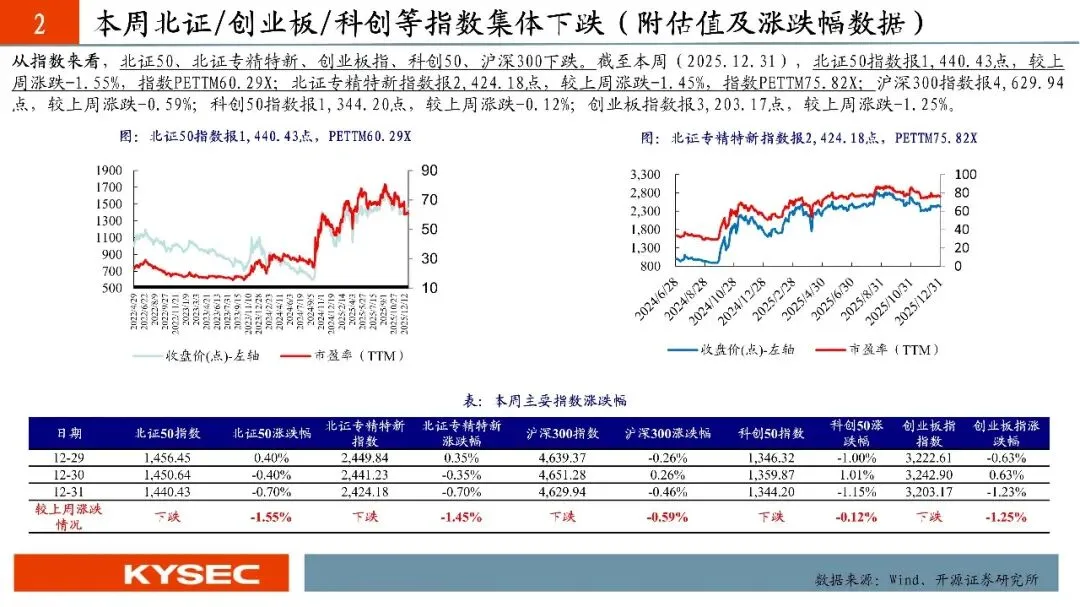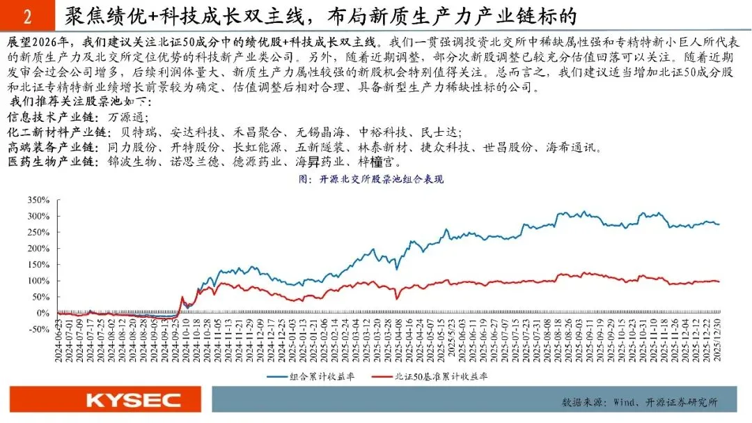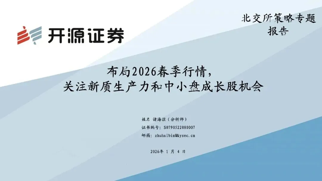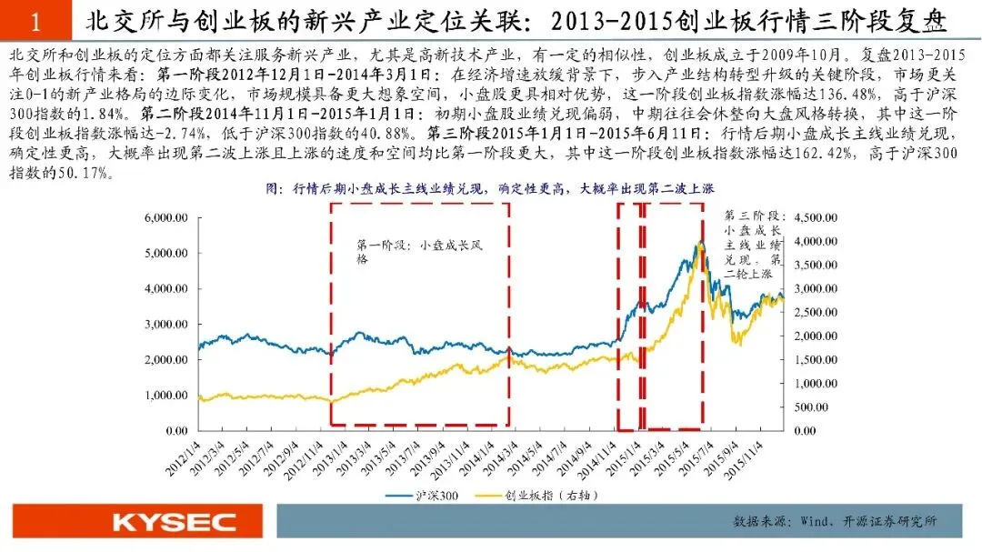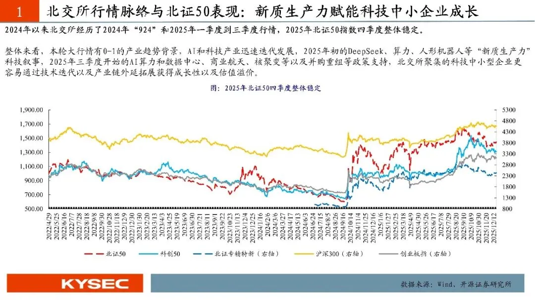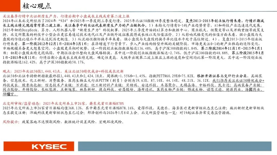 2024年以来北交所经历了2024年“924”和2025年一季度到三季度行情,2025年北证50指数四季度整体稳定。复盘2013-2015年创业板行情来看,行情后期成长主线业绩兑现通常有第二波上涨,关注春季中的北证代表新质生产力的产业链机会。1)本轮大行情有0-1的产业趋势背景,AI和科技产业迅速迭代发展,2025年初的DeepSeek、算力、人形机器人等“新质生产力”科技叙事,2025年三季度开始的AI算力和数据中心、商业航天、核聚变等以及并购重组等政策支持,北交所聚集的科技中小型企业更容易通过技术迭代以及产业链外延拓展获得成长性以及估值溢价。2)从影响风格变化的估值方面来看,微小盘股与大盘股的估值比值水平并未达到历史极值。3)从流动性指标换手率来看,微小盘股与大盘股的换手率比值水平处于高位附近。4),复盘2013-2015年创业板行情来看,第一阶段2012年12月1日-2014年3月1日:在济增速下行背景下,步入产业结构转型升级的关键阶段,市场更关注0-1的新产业格局的边际变化,市场规模具备更大想象空间,小盘股更具相对优势,这一阶段创业板指数涨幅达136.48%,高于沪深300指数的1.84%。第二阶段2014年11月1日-2015年1月1日:初期小盘股业绩兑现偏弱,中期往往会休整向大盘风格转换,其中这一阶段创业板指数涨幅达-2.74%,低于沪深300指数的40.88%。第三阶段2015年1月1日-2015年6月11日:行情后期小盘成长主线业绩兑现,确定性更高,大概率出现第二波上涨且上涨的速度和空间均比第一阶段更大,其中这一阶段创业板指数涨幅达162.42%,高于沪深300指数的50.17%。