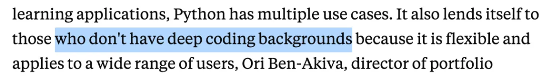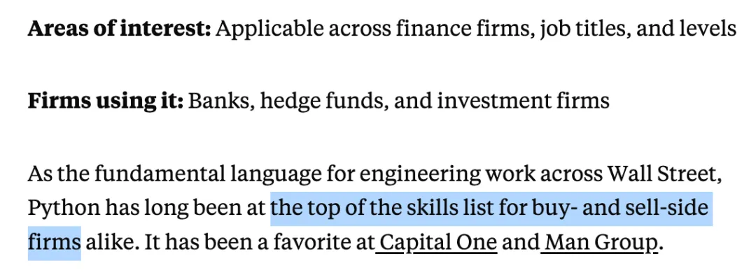 如今,哪怕0编程经验的同学,也会在进入金融行业前自学Python。不管你是否是科技岗位,不管是对冲基金还是投行员工,很多人会把Python作为自己的第一个入门语言。因为相比其他编程语言,Python的语句最接近英语语法,且代码量少,只要你会英语,就能很轻松入门Python。