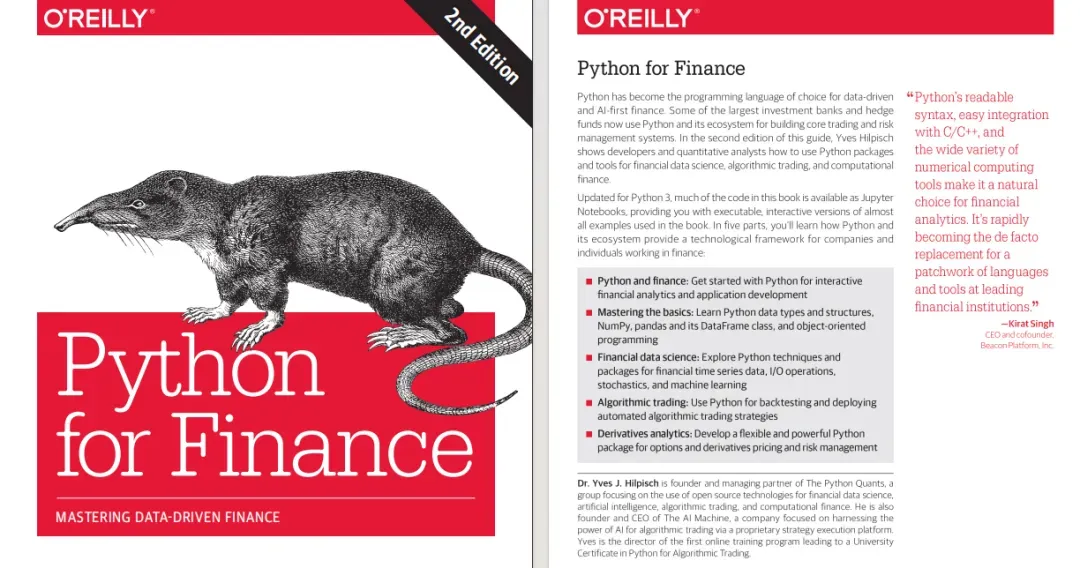 Python for Fiancne是很多商科生学习Python的第一本教科书。在它更新到第2版后,已经从一本纯教科书进化到实战型手册👇
