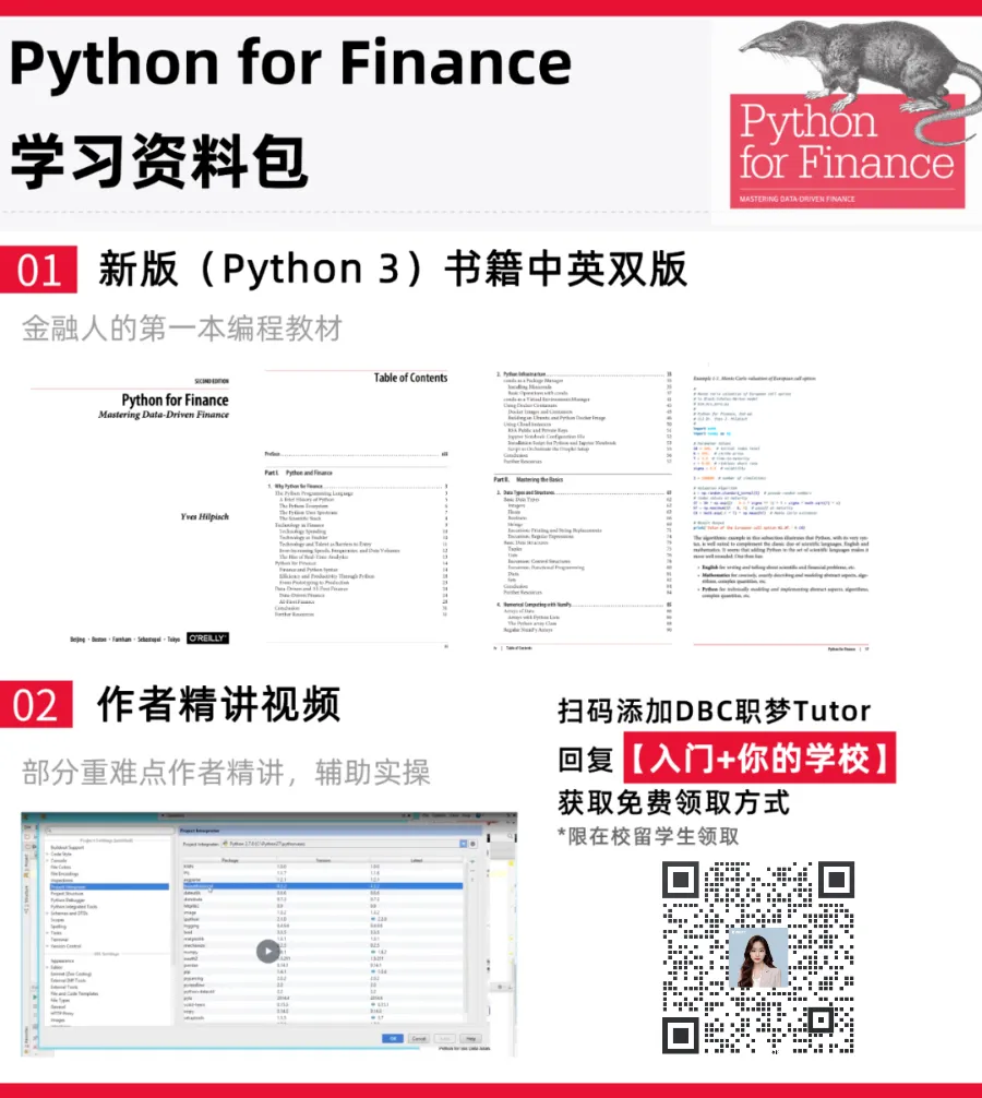 同时,书中还附带附数据集与练习题,是初学者从零经验进阶到量化开发初级水平的一站式宝典。建议商科留学生们都阅读看看,相信你会对Python在金融领域的应用有全新的认识。