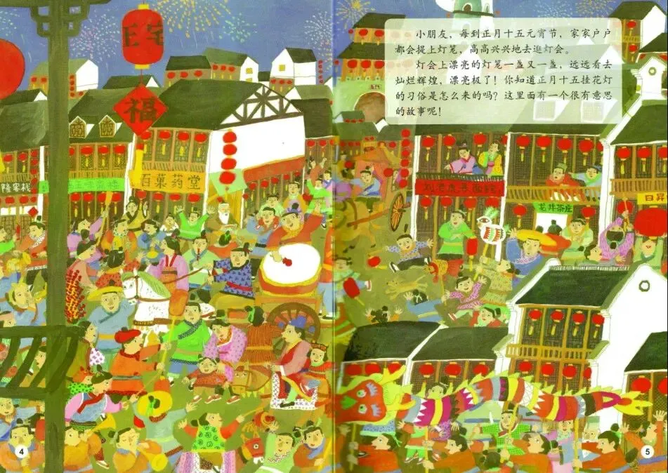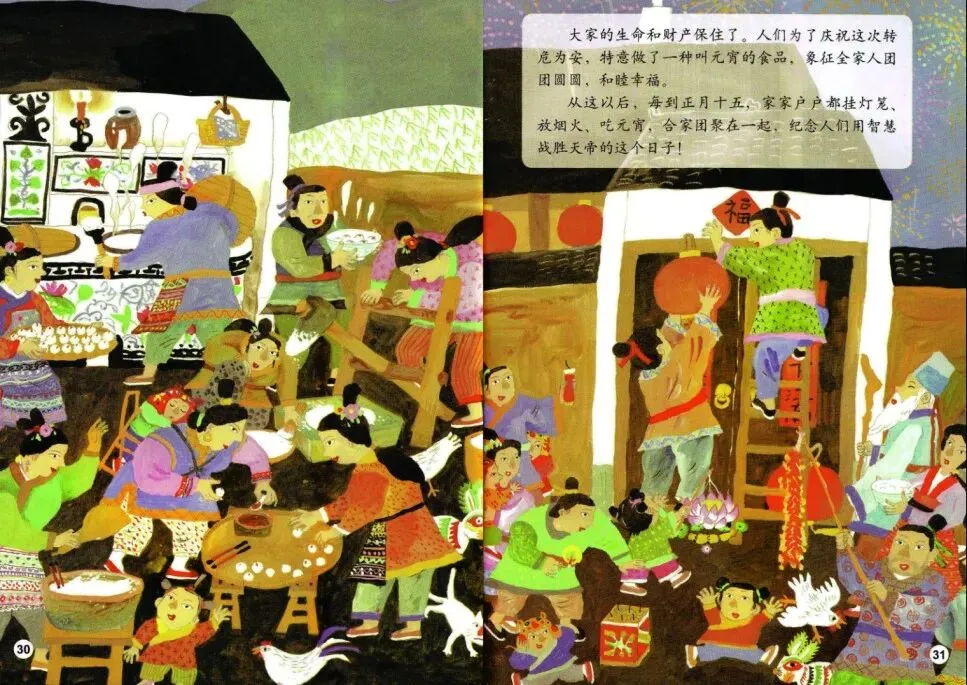 从这以后,每到正月十五,家家户户都挂灯笼、放烟火、吃元宵,合家团聚在一起,纪念人们用智慧战胜天帝的这个日子!
