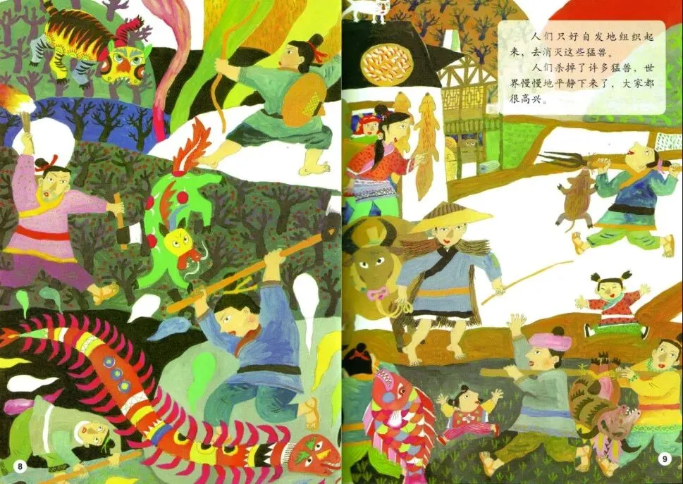 像凿齿呀、九婴呀、大风呀……这些猛兽长得怪模怪样,脾气又坏。它们在大地上到处乱闯,伤害人和牲畜。